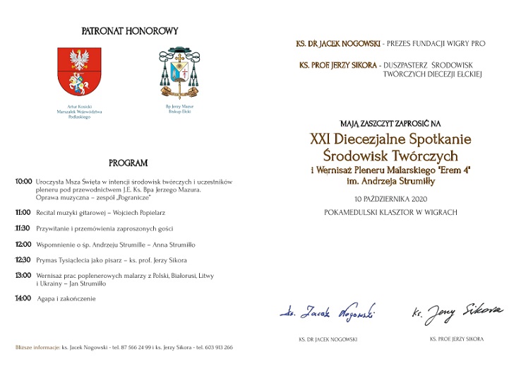 Biskup ełcki Jerzy Mazur, ks. dr. Jacek Nogowski – Prezes fundacji Wigry Pro oraz ks. prof. Jerzy Sikora – Duszpasterz Środowisk Twórczych Diecezji Ełckiej na to wydarzenie zapraszają szczególnie artystów, pracowników kultury i dziennikarzy.