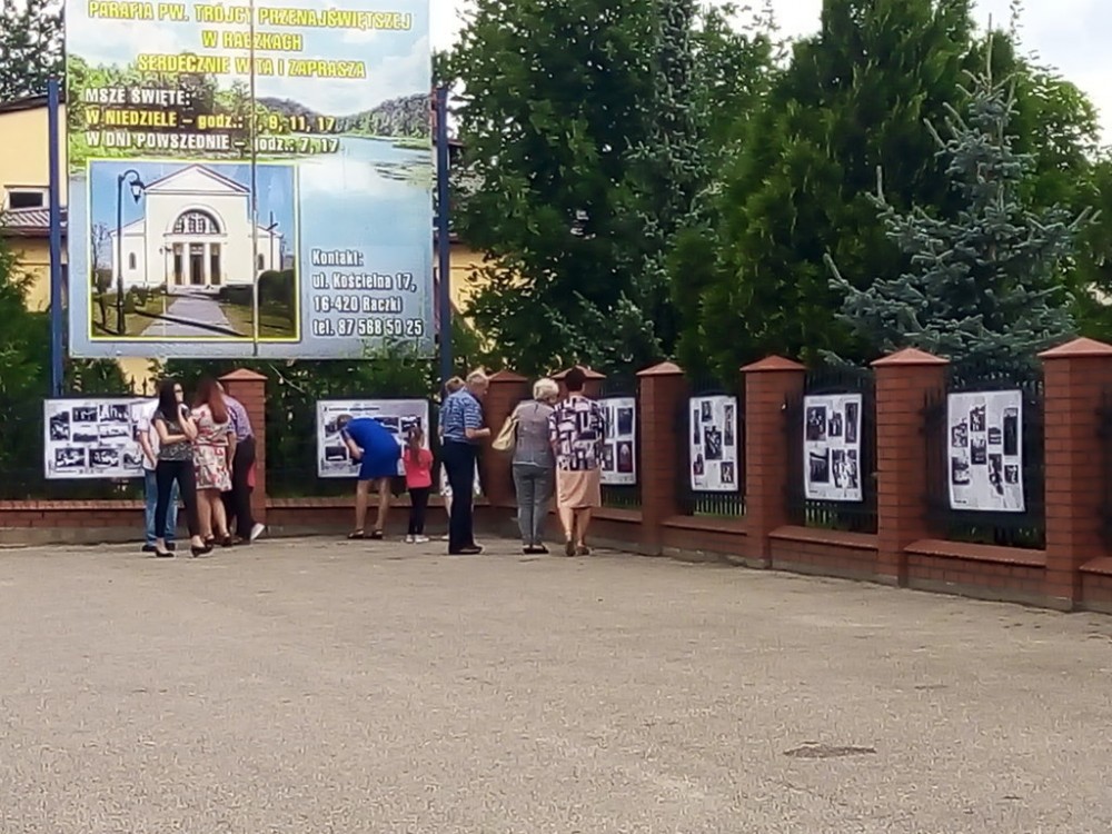 W południe na parkingu przykościelnym odbyło się oficjalne otwarcie plenerowej wystawy "Z życia parafii pw. Trójcy Przenajświętszej w Raczkach na archiwalnej fotografii z lat 1910-1990", którą zorganizowały Gminny Ośrodek Kultury w Raczkach i Raczkowskie Archiwalia. Zdjęcia opracował Marcin Pawlukiewicz.