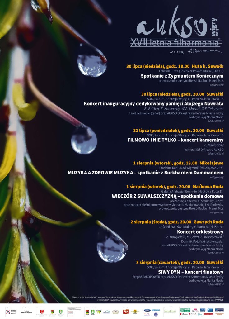 Festiwal zainauguruje 30 lipca (niedziela) koncert dedykowany pamięci zmarłego artysty rzeźbiarza Alojzego Nawrata z udziałem Karola Kozłowskiego oraz AUKSO Orkiestry Kameralnej Miasta Tychy pod dyrekcją Marka Mosia. W programie między innymi utwory G.F. Haendla, B. Brittena i Zygmunta Koniecznego. W poniedziałek, 31 lipca, zapraszamy na koncert „Filmowo i nie tylko…” w wykonaniu kameralistów AUKSO, podczas którego wysłuchamy znanych utworów autorstwa tegorocznego Jubilata Zygmunta Koniecznego w opracowaniu instrumentalnym. XVIII Filharmonię zakończymy w czwartek, 31 sierpnia mocnym uderzeniem podczas finałowego koncertu orkiestrowego, w którym na scenie pojawią się w autorskim programie zespół ZAKOPOWER oraz Orkiestra AUKSO.