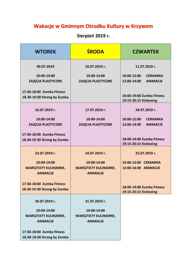 Harmonogram wakacyjny dotyczy lipca i sierpnia.