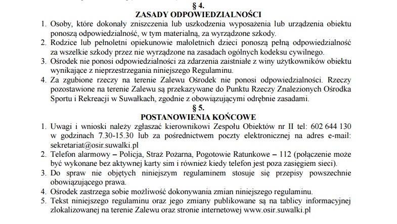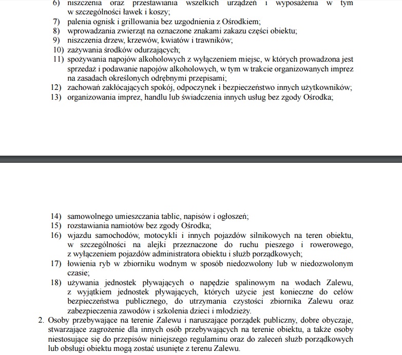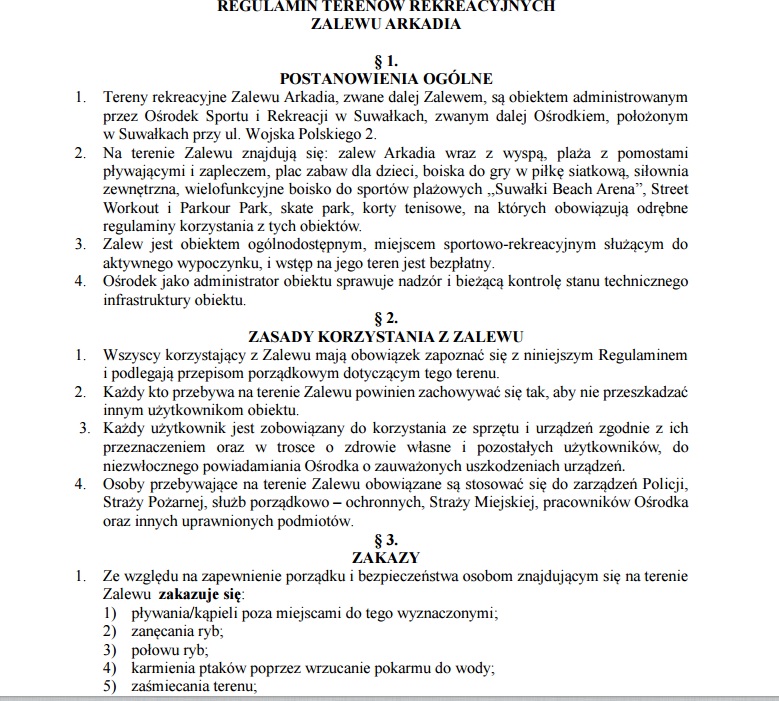 Zgodnie z zaleceniami naukowców z olsztyÅ„skiej uczelni obligatoryjnym elementem procesu oczyszczania jest zmiana sposobu korzystania z Zalewu Arkadia. Dlatego też OÅ›rodek Sportu i Rekreacji w SuwaÅ‚kach wprowadziÅ‚ nowy regulamin, który bÄ™dzie obowiÄ…zywaÅ‚ od 1 kwietnia 2017 r.