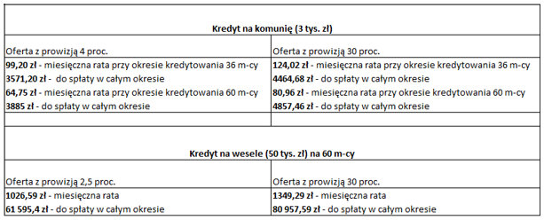 Eksperci z ANG SpóÅ‚dzielni Doradców Kredytowych porównali różne oferty kredytu na 3 tys. zÅ‚ i 50 tys. zÅ‚. Wyniki zostaÅ‚y przedstawione w tabeli: