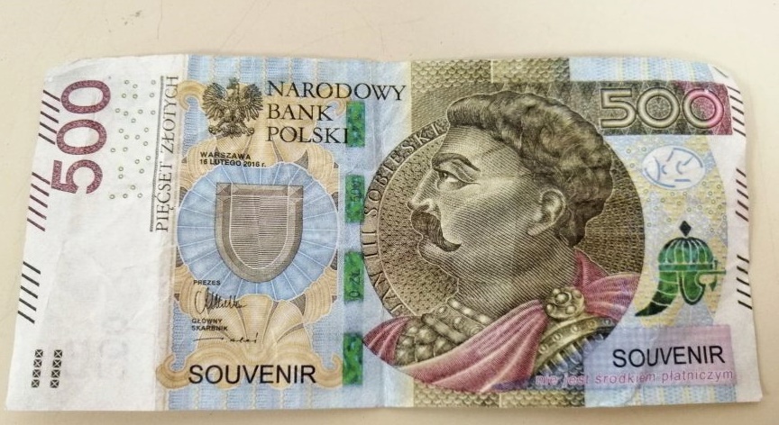 Suwalscy policjanci ustalili mężczyznę, który w jednym ze sklepów na terenie gminy Suwałki zapłacił za towar imitacją banknotu z napisem „souvenir” o nominale 500 złotych.