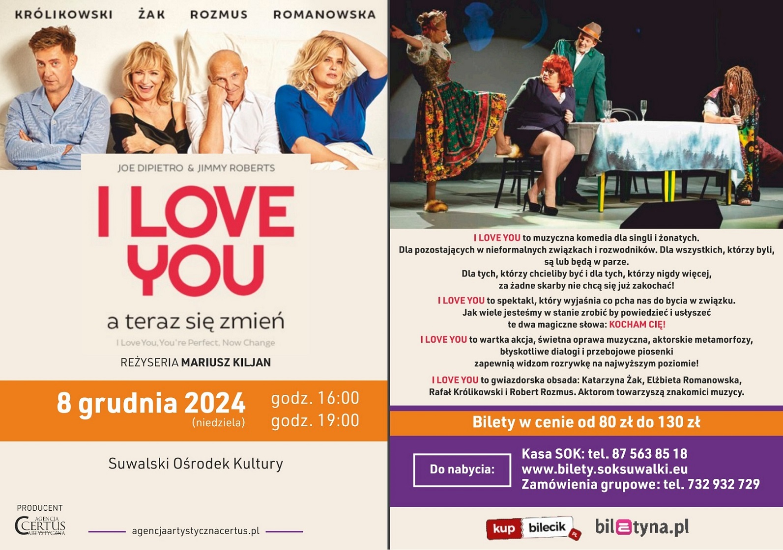 Już teraz można zarezerwować dzieÅ„ – 8 grudnia 2024 r. i wybrać godzinÄ™ – 16:00 lub 19:00. W spektaklu, który wyjaÅ›nia co pcha nas do bycia w zwiÄ…zku, jak wiele jesteÅ›my w stanie zrobić by powiedzieć i usÅ‚yszeć magiczne „kocham ciÄ™!” zagrajÄ… Katarzyna Å»ak, Elżbieta Romanowska, RafaÅ‚ Królikowski Robert Rozmus, a towarzyszyć im bÄ™dÄ… znakomici muzycy.