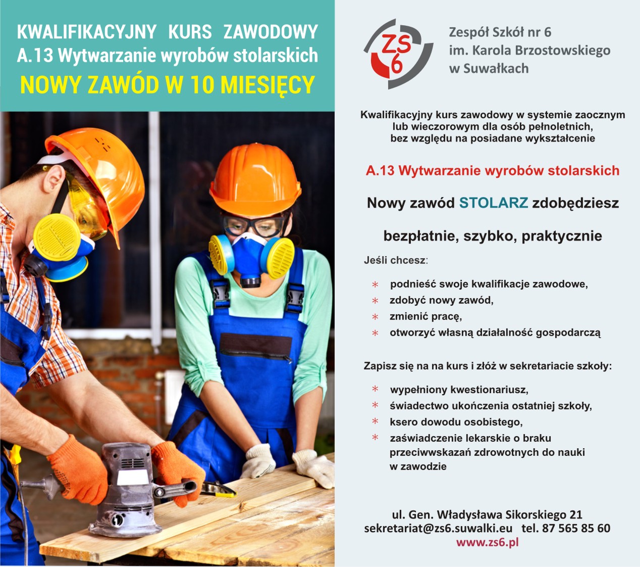 kwalifikacyjny kurs zawodowy w zawodzie stolarz. Nauka jest bezpłatna. Kurs