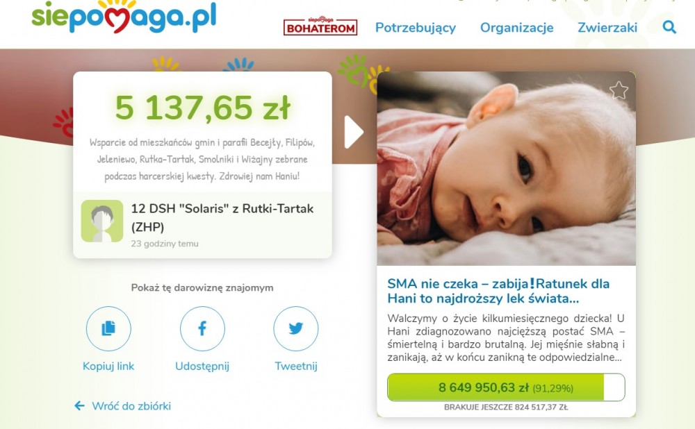 Harcmistrz Krzysztof Masłowski z patrolem z 12 DSH „Solaris” w Rutce-Tartak uzyskali podczas zbiórki kwotę 5 137,65 zł. Została ona wpłacona na konto https://www.siepomaga.pl/hania. Harcerze z Rutki-Tartak namawiają innych do niesienia pomocy!