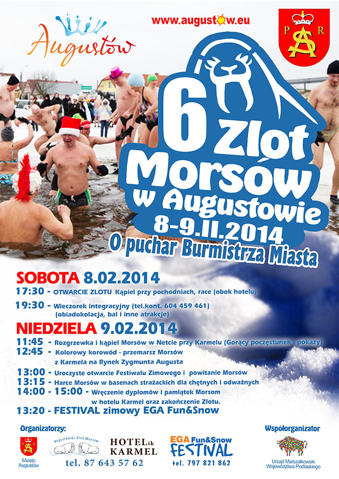 W mieÅ›cie odbÄ™dzie siÄ™ szósty Zlot Morsów. BÄ™dzie kÄ…piel przy pochodniach, przemarsz Morsów w kolorowym korowodzie ulicami Augustowa, harce w basenach strażackich, spotkanie integracyjne i bal.