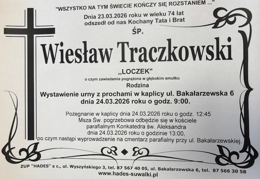 Uroczystości pogrzebowe Wiesława Traczkowskiego odbędą się we wtorek, 24 marca. Msza św. W konkatedrze św. Aleksandra o godz. 13:00.