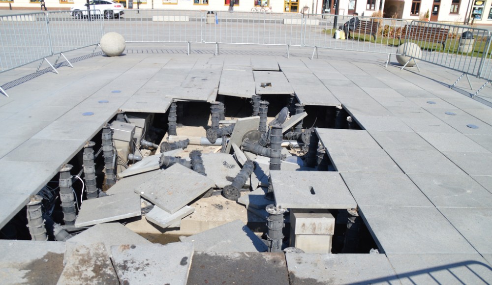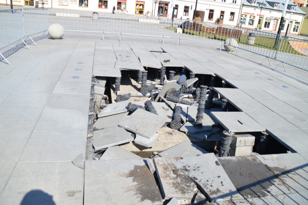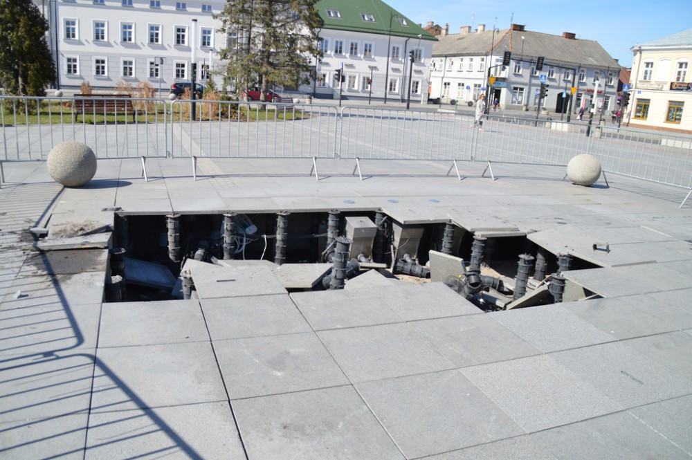Dzban - tak najdelikatniej określali nasi Czytelnicy kierowcę niewielkiego dźwigu, który we wtorek zniszczył nawierzchnię Placu Marii Konopnickiej. Znajdujące się pod nią urządzenia fontanny wyglądają tragicznie.