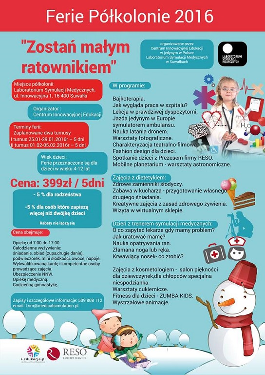 Zajęcia będą odbywały się od 7.00 do 17.00. Koszt z całodziennym wyżywieniem (śniadanie, obiad, podwieczorek, słodkości, owoce)i ubezpieczeniem to jedyne 399 zł za tydzień. Więcej informacji na plakacie oraz pod nr tel. 509 808 112, adres email: Lsm@medicalsimulation.pl
