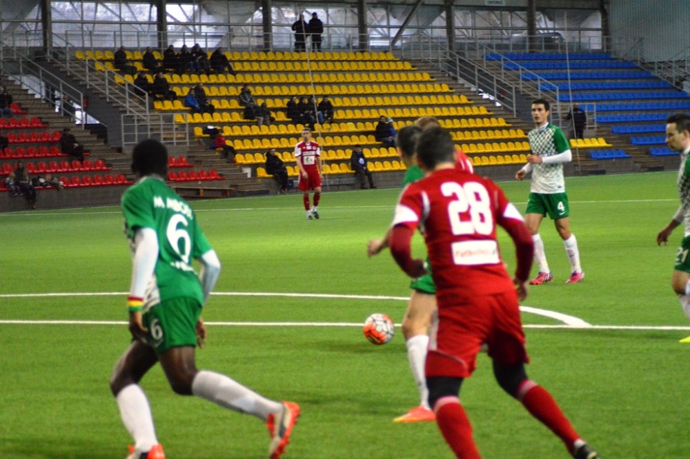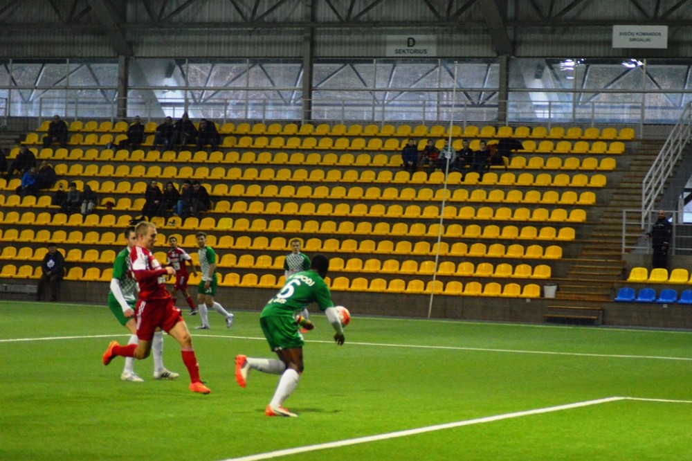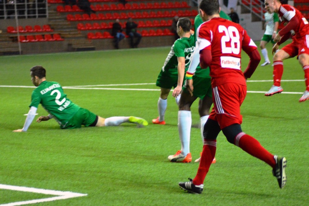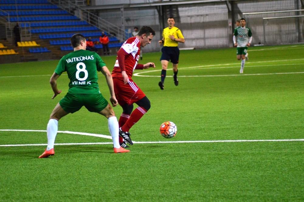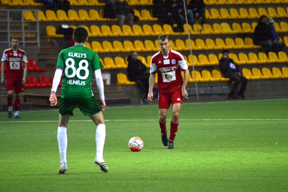 W pierwszej połowie bardzo dobrze w przodzie poczynali sobie Omar Santana, Miłosz Kozak i Aleksandar Atanacković. Bliski zdobycia gola, po dośrodkowaniu z rożnego, był Tomasz Jarzębowski. Mistrzowie Litwy, wśród których najlepszy był chyba lewonożny Donavan Slijngard, stworzyli jedna 100-procentową okazję i przeprowadzili kilka groźnych, oskrzydlających akcji, ale bezbłędny w bramce był Karol Salik. Remis po dobrej pierwszej połowie był jak najbardziej zasłużony.