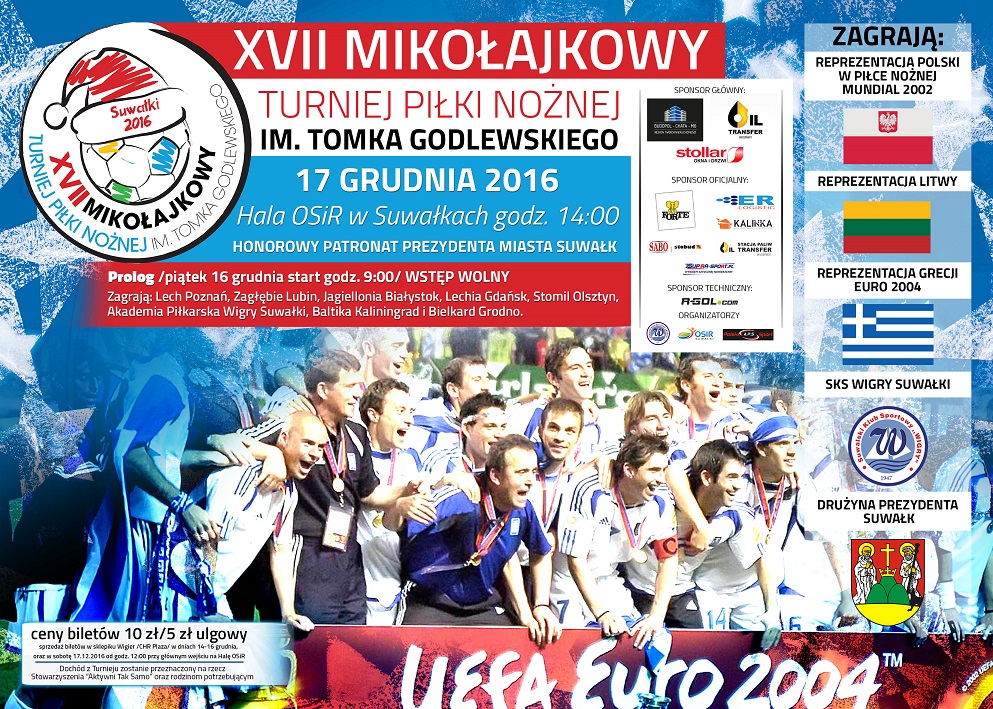 Całkiem za darmo będzie można wejść do hali OSiR dzień wcześniej, w piątek 16 grudnia. O godz. 9 rozpocznie się w niej międzynarodowy Prolog Mikołajkowego Turnieju im. Tomka Godlewskiego z udziałem 8-letnich zawodników czołowych akademii piłkarskich z Polski, Rosji i Białorusi. Zagrają: Lech Poznań, Zagłębie Lubin, Jagiellonia Białystok, Lechia Gdańsk, Stomil Olsztyn, AP Wigry Suwałki, Baltika Kaliningrad i Bielkard Grodno.