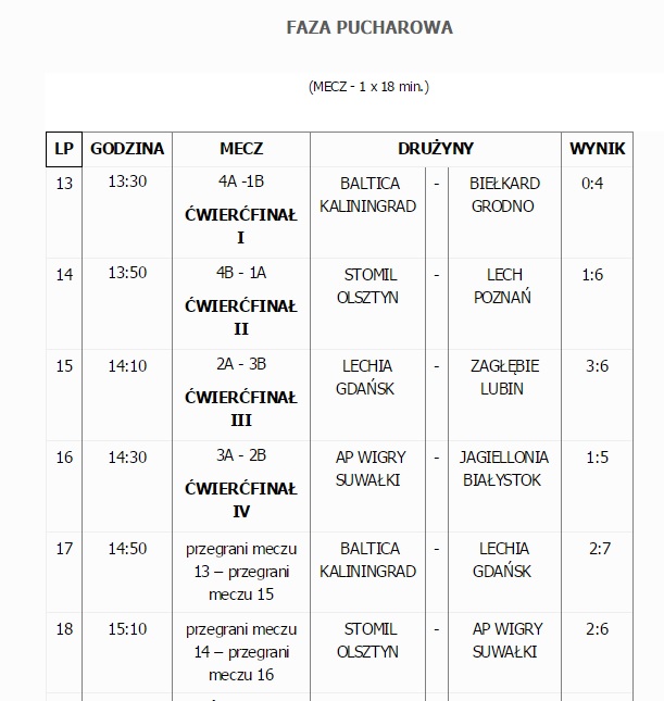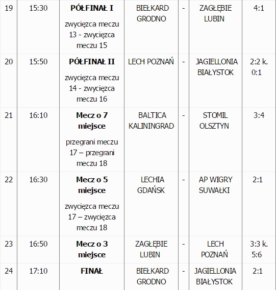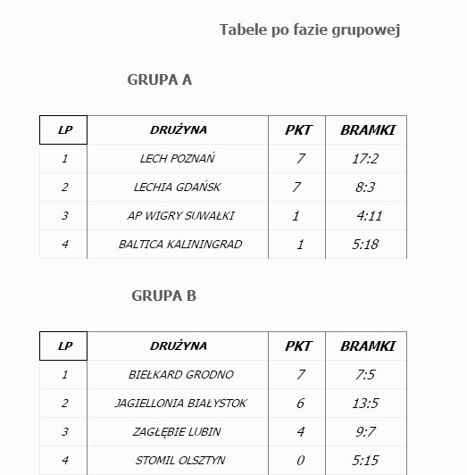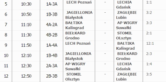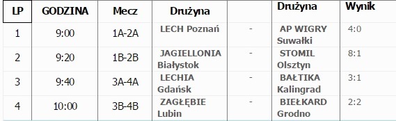 Traf chciaÅ‚, ze w meczu otwarcia zmierzyli siÄ™ ubiegÅ‚oroczni finaliÅ›ci. Lech PoznaÅ„ pokonaÅ‚ Wigry SuwaÅ‚ki 4:0. Przed wyższa porażkÄ… uratowaÅ‚ gospodarzy bramkarz MichaÅ‚ DÄ™bski. Grad goli padÅ‚ w kolejnym spotkaniu, w którym Jagiellonia BiaÅ‚ystok (żóÅ‚to-czerwoni) wygraÅ‚a 8:1 ze Stomilem Olsztyn. BiaÅ‚o-zieloni z Lechii GdaÅ„sk pokonali 3:1 rówieÅ›ników z Bałłtiki Kaliningrad. A w spotkaniu noszÄ…cych te same barwy Zagłębia Lubin (na zdjÄ™ciach w zielonych kamizelkach) i BieÅ‚kardu Grodno padÅ‚ remis 2:2.