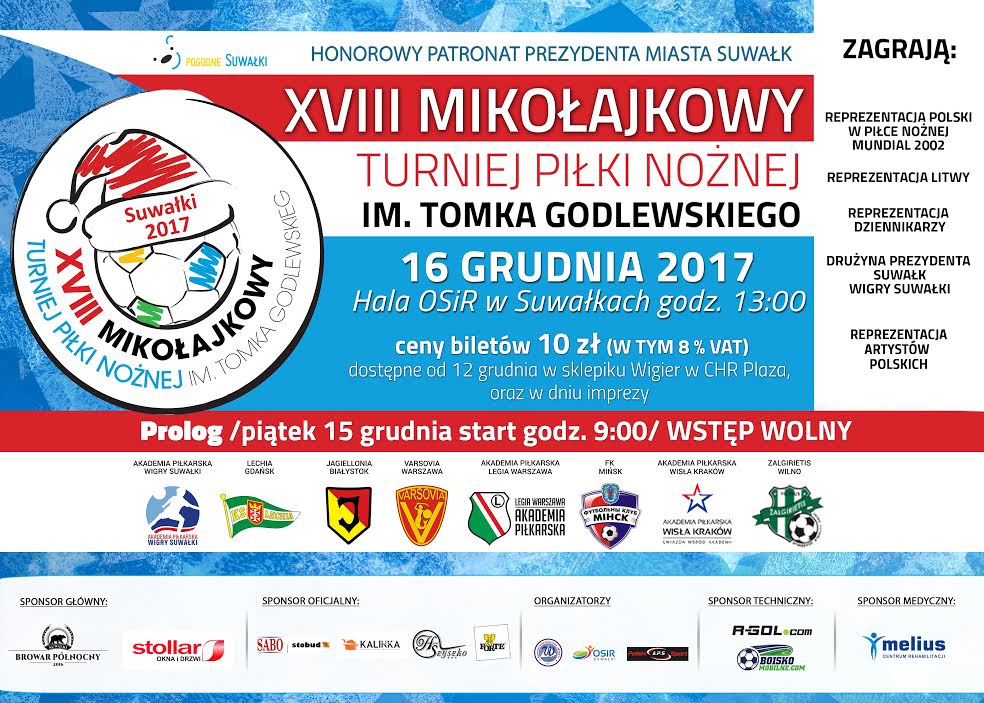 Do rywalizacji w 18. już edycji MikoÅ‚ajkowego Turnieju PiÅ‚ki Nożnej im. Tomka Godlewskiego przystÄ…pi pięć drużyn: Drużyna Jerzego Engela Mundial 2002, Reprezentacja Litwy, Reprezentacja Artystów Polskich, PiÅ‚karska Reprezentacja Dziennikarzy i Drużyna Prezydenta SuwaÅ‚k – Wigry SuwaÅ‚ki.