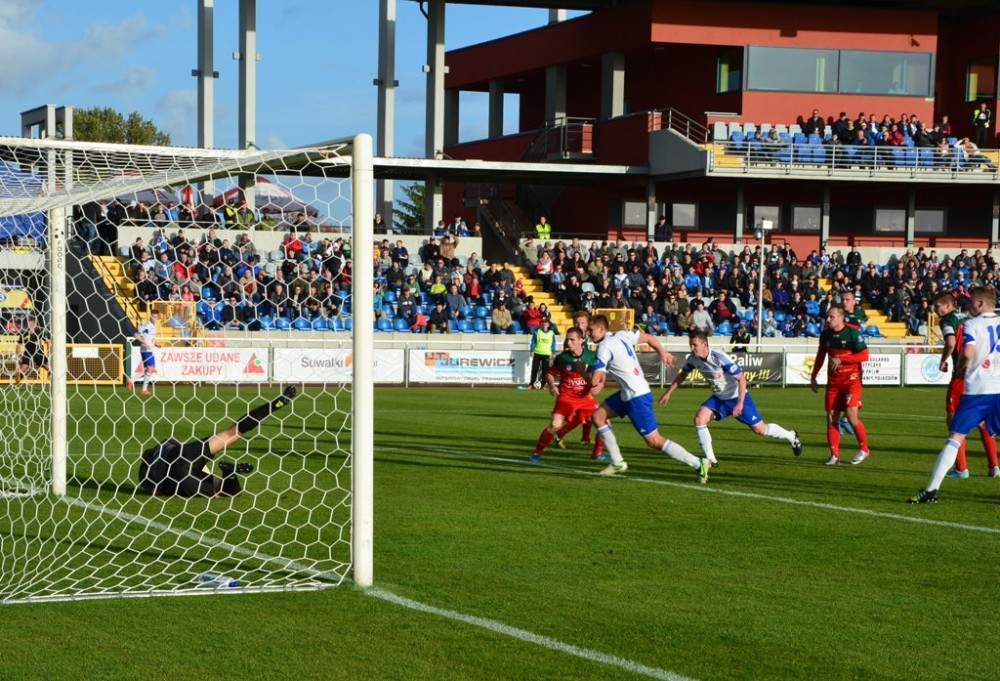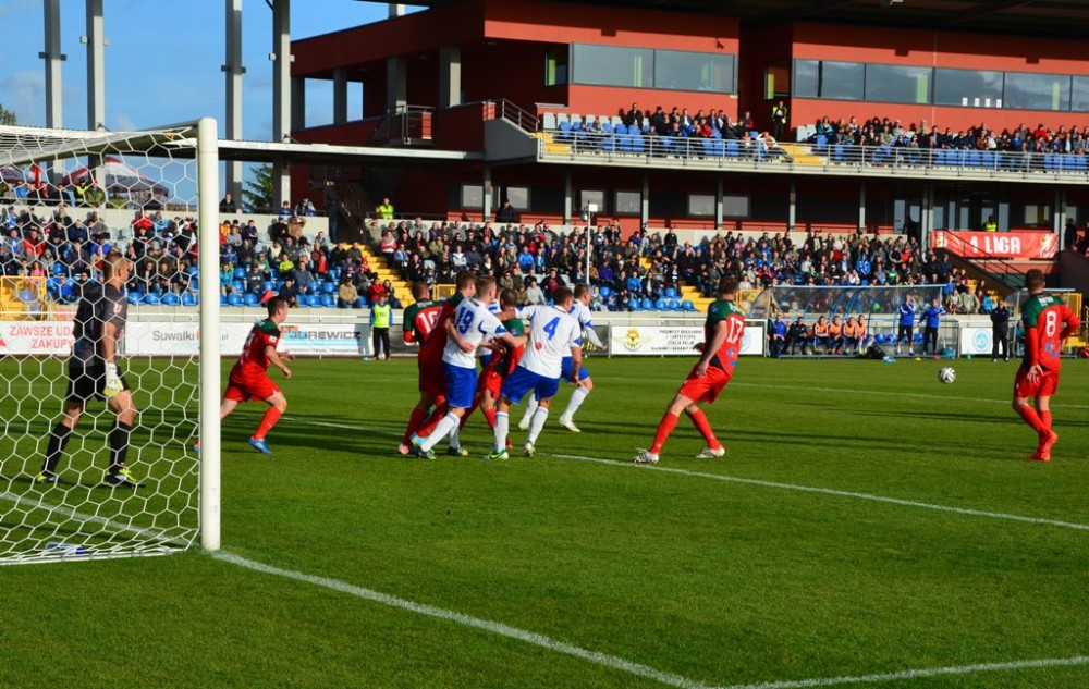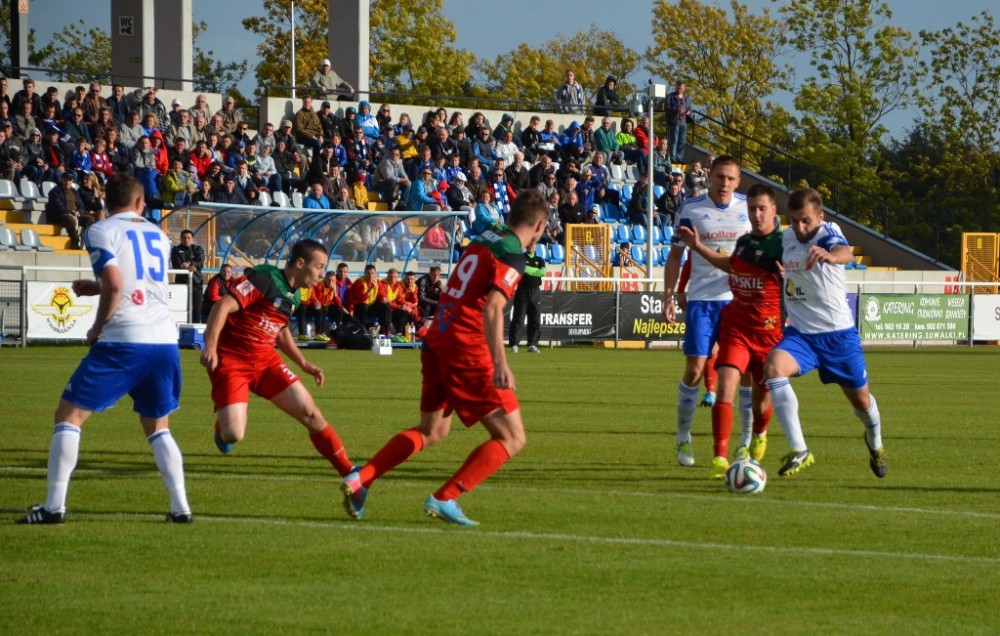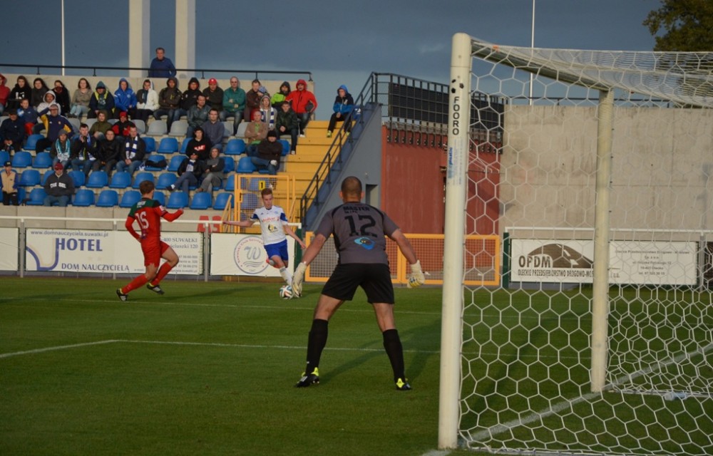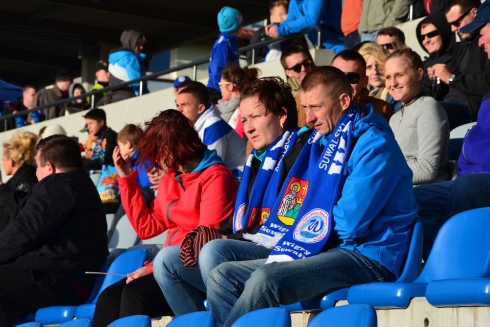 Do suwalczan należała pierwsza połowa i początek drugiej. Biało-niebiescy atakowali środkiem i skrzydłami, ale tylko sporadycznie kończyli akcje strzałami. Kilka razy za daleko wypuścił sobie piłkę Mateusz Żebrowski, do zagranej przez niego wzdłuż bramki gości piłki nie doszedł Mackiewicz, który próbowal dwójkowych akcji z Kamilem Adamkiem. Najlepsze przed przerwą sytuacje zaprzepaścili Maksims Rafalskis i Marcin Tarnowski. Po zmianie stron groźnie główkował Kamil Lauryn, a z przewrotki uderzał Sebastian Radzio. Zamiast strzelać, Żebrowski mógł dograć do Darvydasa Sernasa, z uderzenie Mackiewicza w krótki róg pewnie sparował Piotr Misztal.