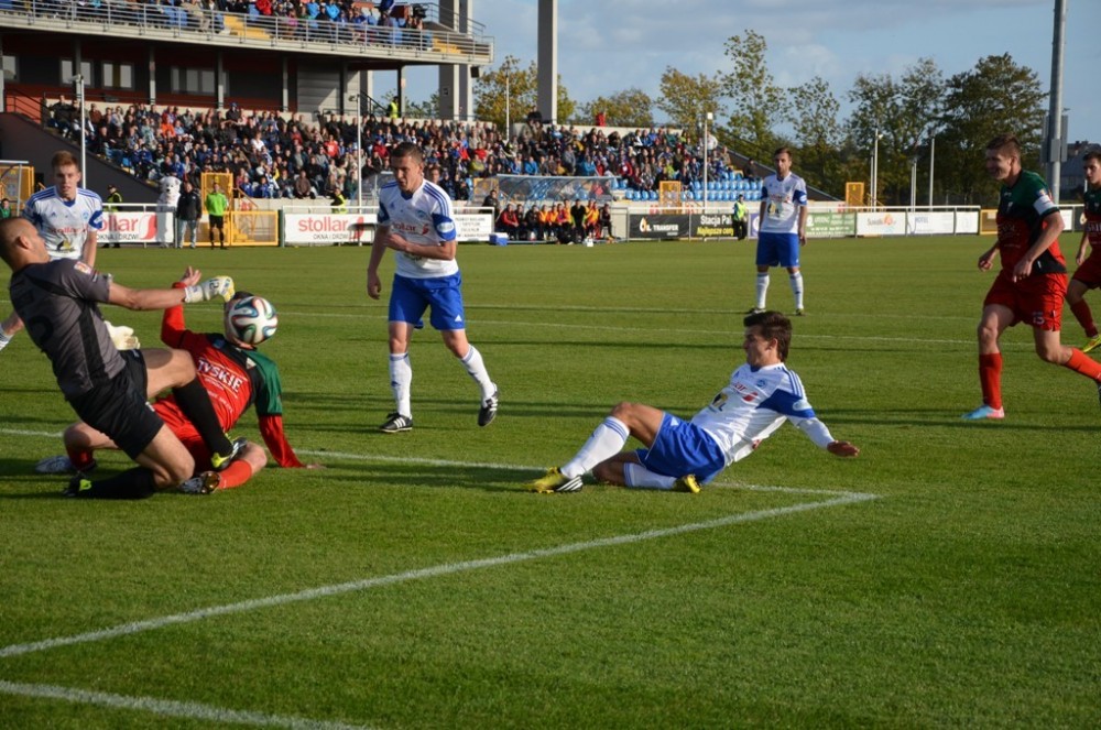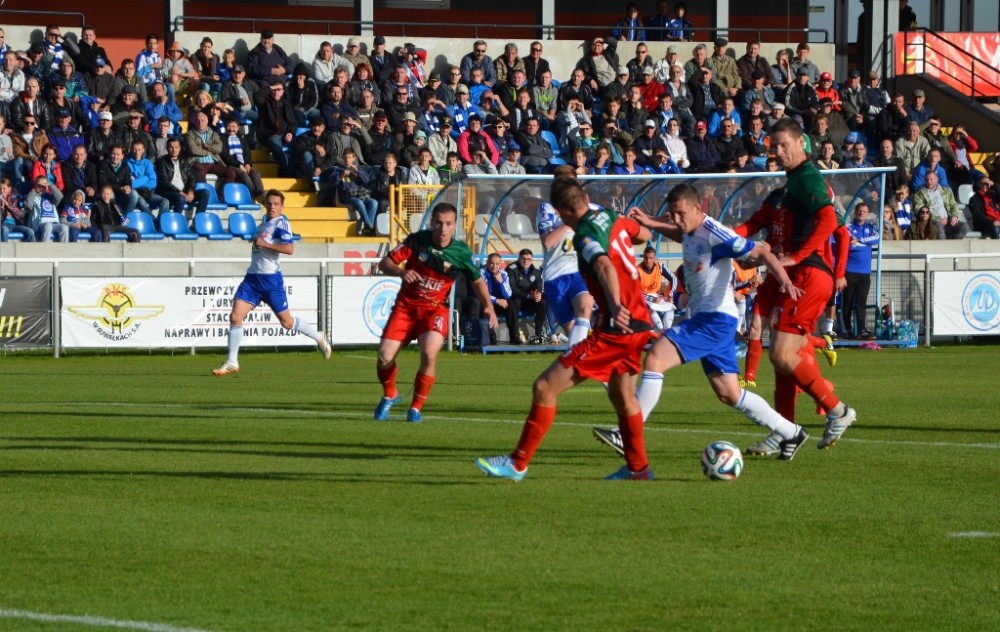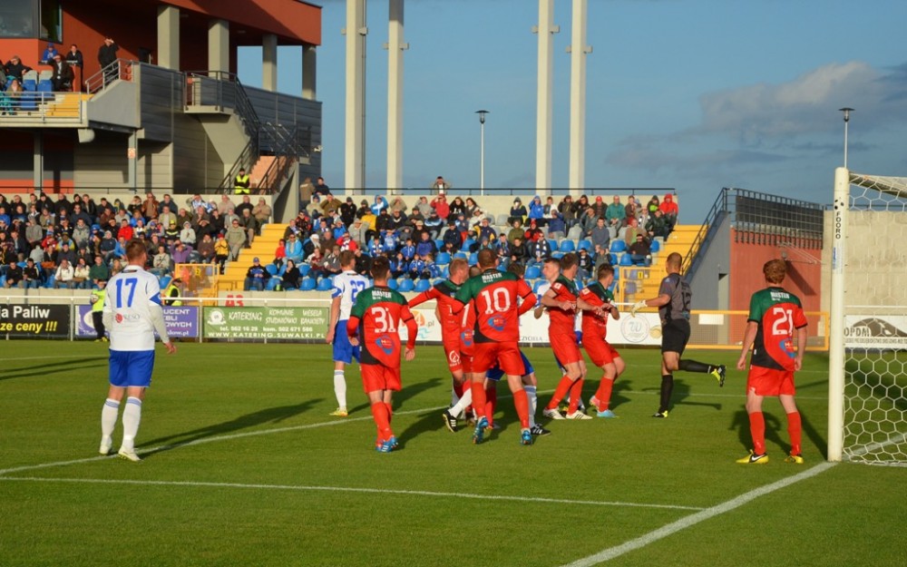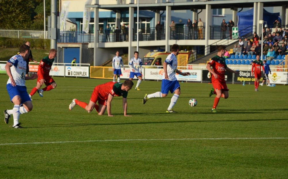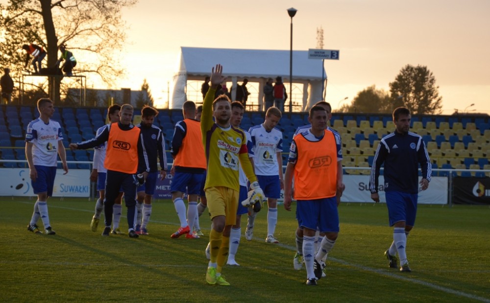 Do suwalczan należała pierwsza połowa i początek drugiej. Biało-niebiescy atakowali środkiem i skrzydłami, ale tylko sporadycznie kończyli akcje strzałami. Kilka razy za daleko wypuścił sobie piłkę Mateusz Żebrowski, do zagranej przez niego wzdłuż bramki gości piłki nie doszedł Mackiewicz, który próbowal dwójkowych akcji z Kamilem Adamkiem. Najlepsze przed przerwą sytuacje zaprzepaścili Maksims Rafalskis i Marcin Tarnowski. Po zmianie stron groźnie główkował Kamil Lauryn, a z przewrotki uderzał Sebastian Radzio. Zamiast strzelać, Żebrowski mógł dograć do Darvydasa Sernasa, z uderzenie Mackiewicza w krótki róg pewnie sparował Piotr Misztal.