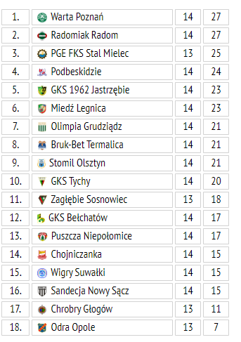 Wigry nadal zajmują 15. miejsce, a po wtorkowym wyjazdowym zwycięstwie w Niepołomicach na fotel lidera wróciła Warta Poznań. Grający w kratkę GKS Tychy nadspodziewanie wysoko wygrał z Miedzią Legnica.