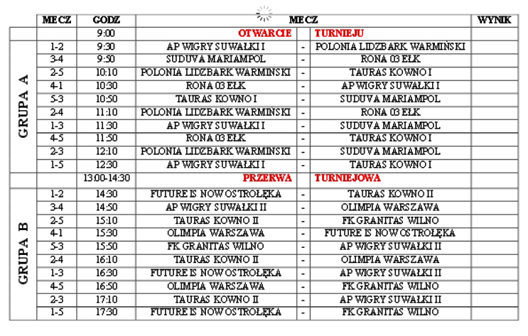 W zawodach 10-letnich o młodszych pilkarzy wezma udzial Granitas Wilno, Tauras Kowno I i II oraz Suduva Mariampol z Litwy, Olimpia Warszawa, Future Is Now Ostrołęka, Polonia Lidzbark Warmiński, Rona 03 Ełk oraz dwa zespoły gospodarzy z Akademii Piłkarskiej Wigry Suwałki.