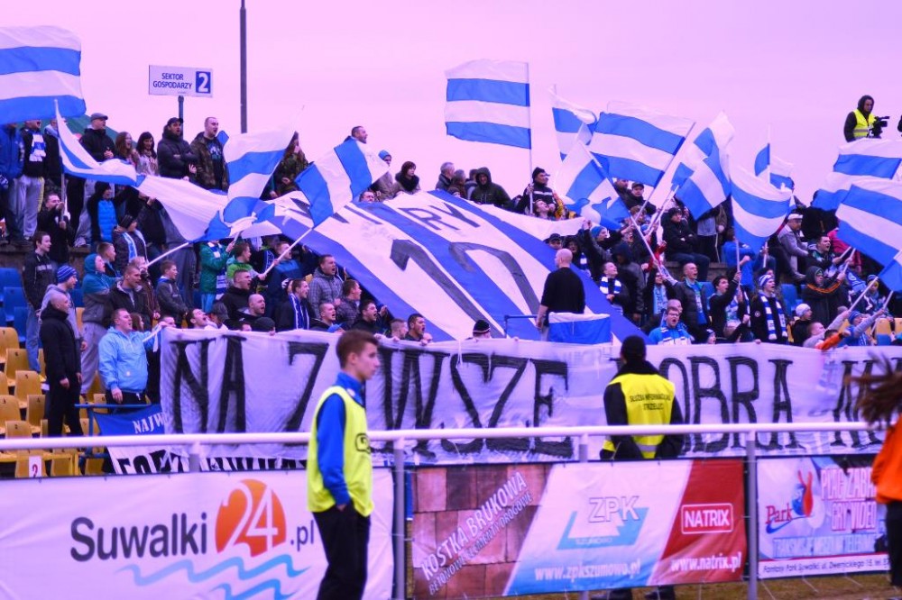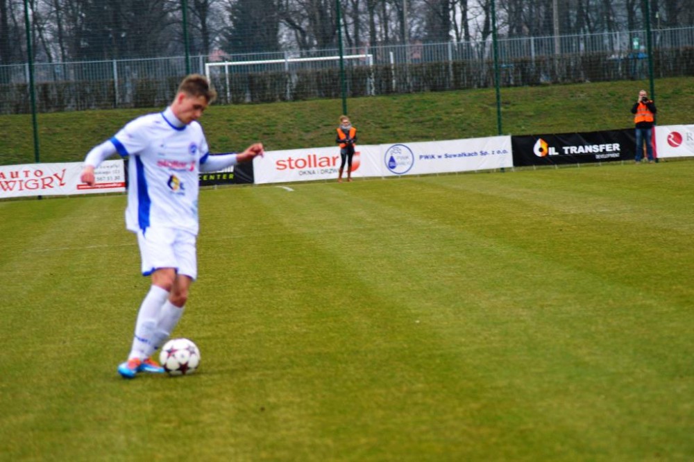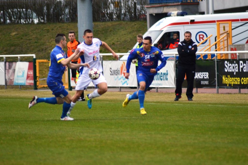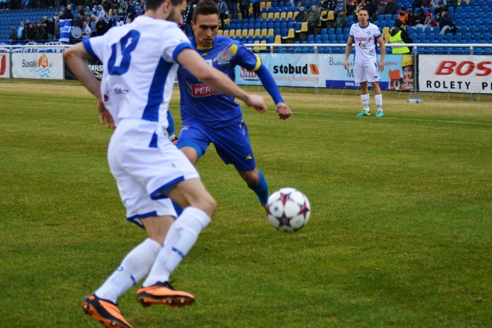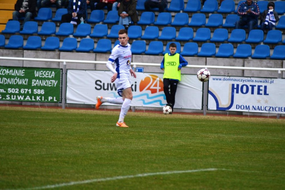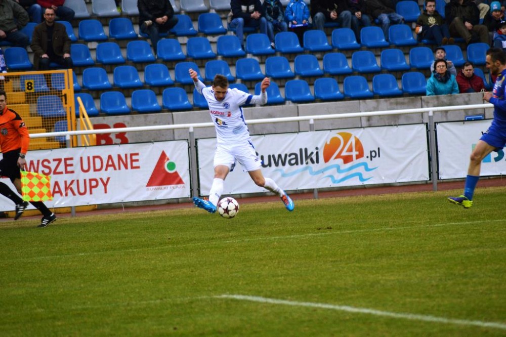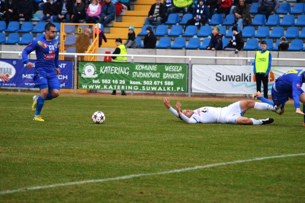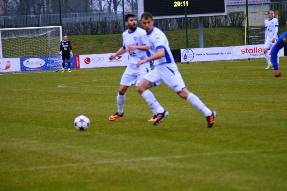 Od pierwszych minut było widać wielkie zaangażowanie i chęć zwycięstwa w grze biało-niebieskich. Suwalczanie grali wysokim pressingiem i przynosiło to efekty. Najlepszą okazję miał w 18 minucie Daniel Michałowski. Po dośrodkowaniu Żebrowskiego, strzał głową pomocnika biało-niebieskich minimalnie minął bramkę gości. Piętnaście minut później dobrą sytuację miał Stanaitis, ale jego uderzenie z woleja wypiąstkował Karol Salik. Trochę kontrowersji było w 41 minucie, w polu karnym gości obrońcę wyprzedził Tuttas, po czym napastnik biało-niebieskich padł w polu karnym. Sędzia nie gwizdnął jednak jedenastki.