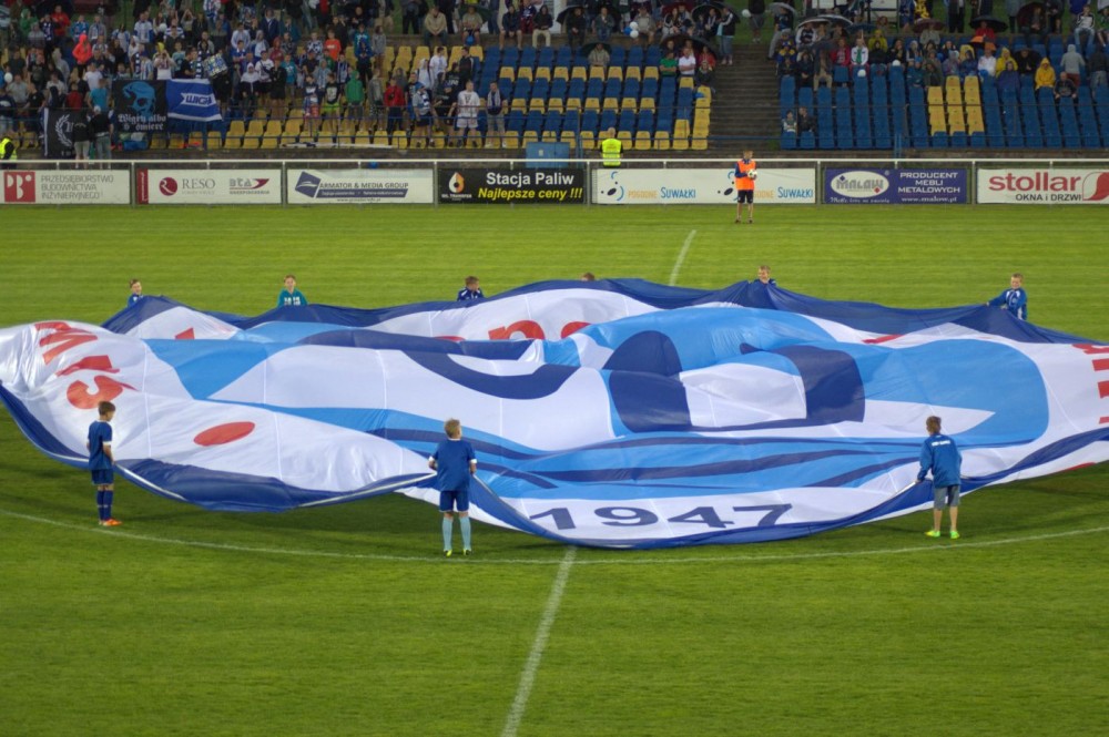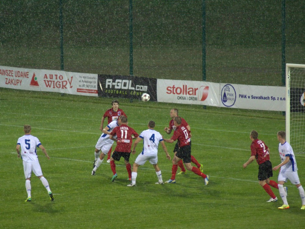 Był to mecz walki, w którym więcej podbramkowych sytuacji stworzyli gospodarze, ale na gola kibice musieli czekać do 27 minuty. Wówczas, po dośrodkowaniu Mateusza Żebrowskiego, bramkarza Pogoni, strzałem głową, pokonał Sebastian Radzio. Ten gol tylko nakręcił suwalczan, którzy zagrażali bramce Jacka Kozaczyńskiego głównie po akcjach skrzydłami Żebrowskiego i Karola Mackiewicza. Bramkarz gości do przerwy nie dał się jednak pokonać po raz drugi.