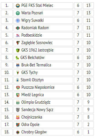 Wigry zdobyły po punkcie w meczach z Chojniczanką i Stalą, a swój dorobek wywindowały ostatnimi trzema zwycięstwami nad Podbeskidziem Bielsko-Biała, Olimpią w Grudziądzu i Bruk-Bet Termalicą Nieciecza.