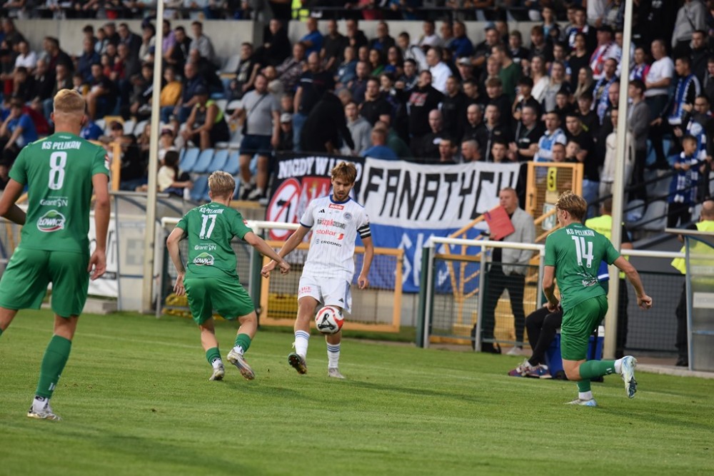 Pelikan jest przedostatni w tabeli, ale nie traci wiary w utrzymanie. U siebie będzie groźnym rywalem, sporo problemów sprawił zresztą Wigrom już jesienią, kiedy w Suwałkach przegrał tylko 1:2 (na zdjęciu).