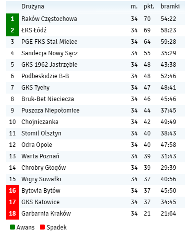 Wigry musiały wygrać w Częstochowie z Rakowem, i wygrały. Gola na 2:1 strzeliły w 92 minucie. W tym momencie było to jednak pyrrusowe zwycięstwo, bowiem w Katowicach, w meczu dwóch innych broniących się przed spadkiem drużyn GKS remisował 1:1 z Bytovią i to katowiczanie utrzymywali się w lidze.