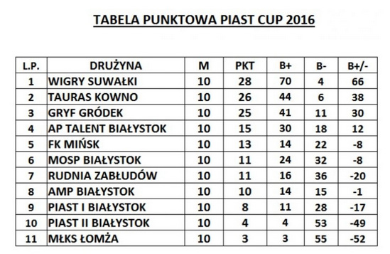 PIAST CUP wygrała drużyna w składzie: Igor Waluś, Dominik Michniewicz, Jakub Suprun, Kamil Kozioł, Wiktor Kowalewski, Jan Bryk, Marcel Jaworowski, Dawid Górski, Stanisław Wasilewski, Mateusz Sobolewski, Mateusz Aleksandrowicz, Gabriel Puza, Szymon Klaus, Jakub Rzodkiewicz, Simon Kowalski.