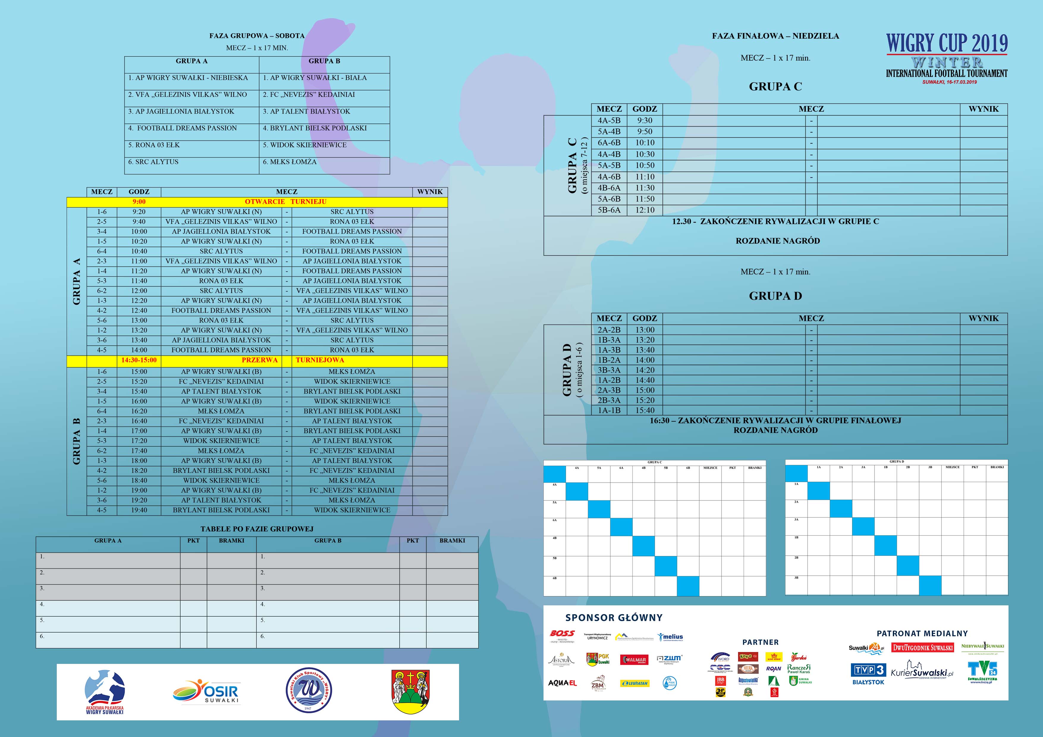 Zmagania młodych adeptów futbolu rozpoczną się w sobotę od godziny 9:00, a potrwają do godziny 20:00. Natomiast faza finałowa odbędzie się w niedzielę w godzinach 9:00 – 16:30. Zapraszamy do hali Ośrodka Sportu i Rekreacji.