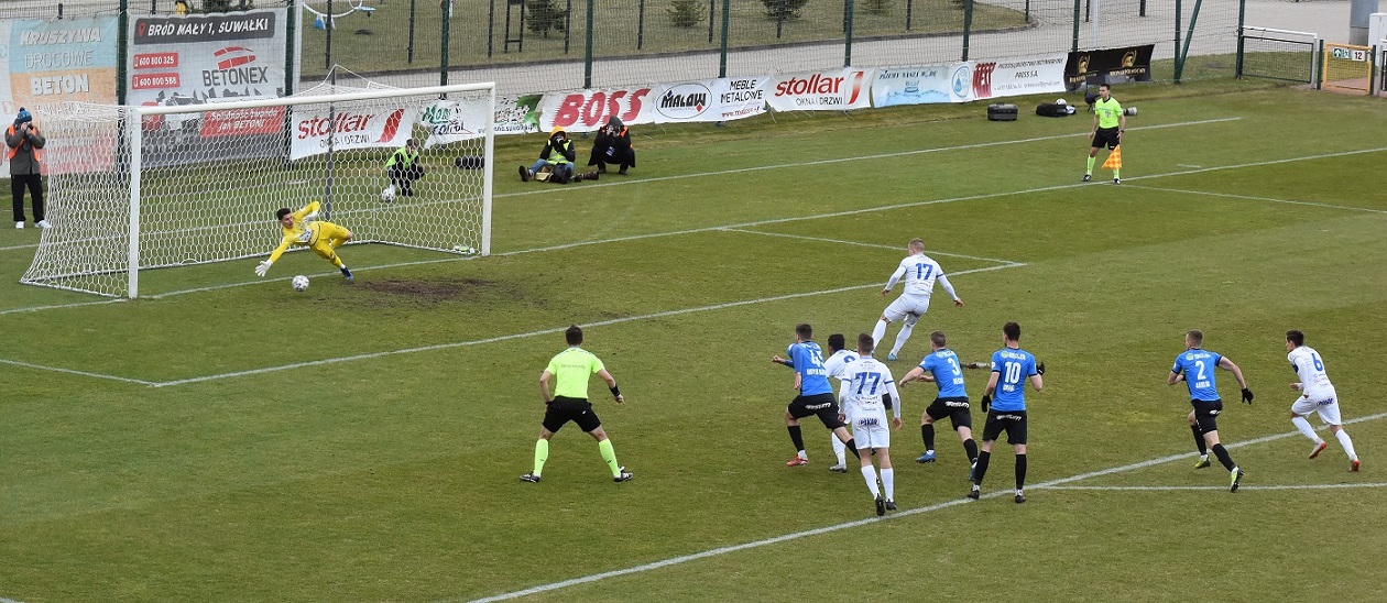 Suwalczanie nie zwalniali tempa i po godzinie gry udało się im wyjść na prowadzenie. Tym razem fatalny błąd przy wyprowadzeniu piłki po podaniu od Adriana Jurkowskiego popełnił bramkarz, Bartłomiej Frasik i nadbiegający Mateusz Lewandowski po raz drugi wpakował piłkę do siatki Hutnika Kraków.