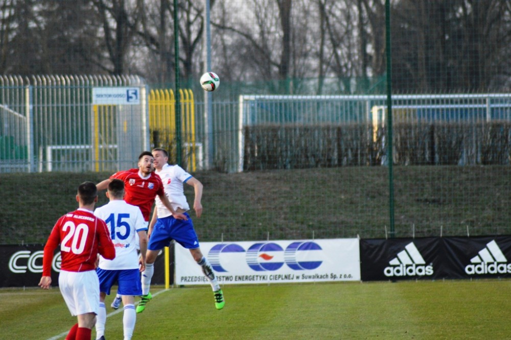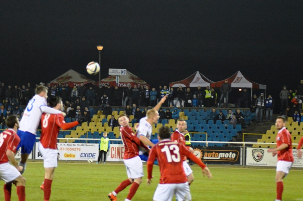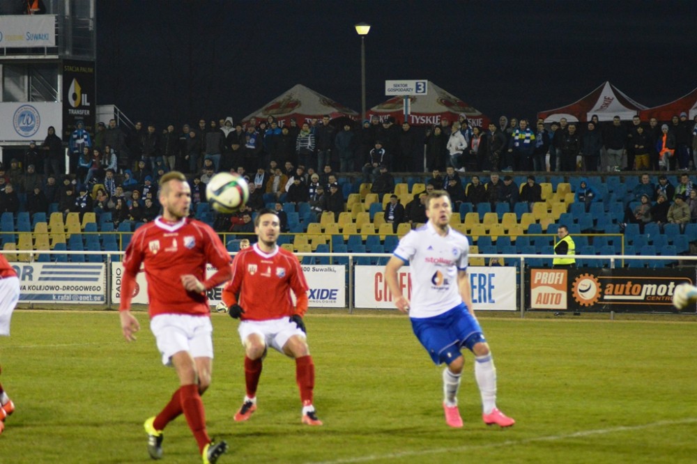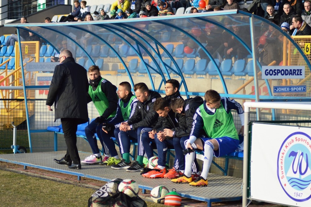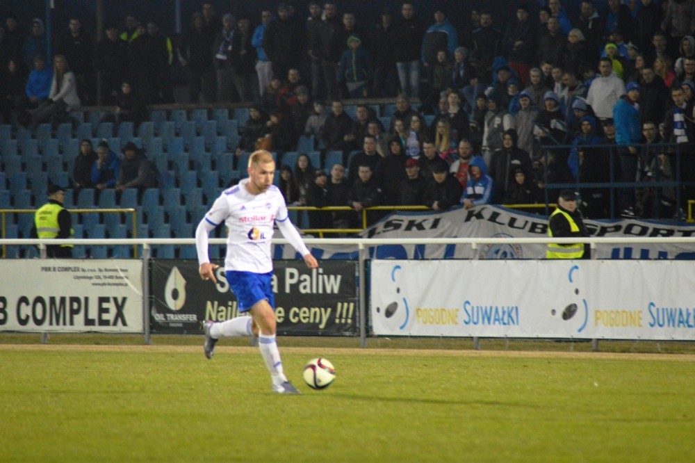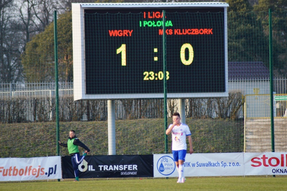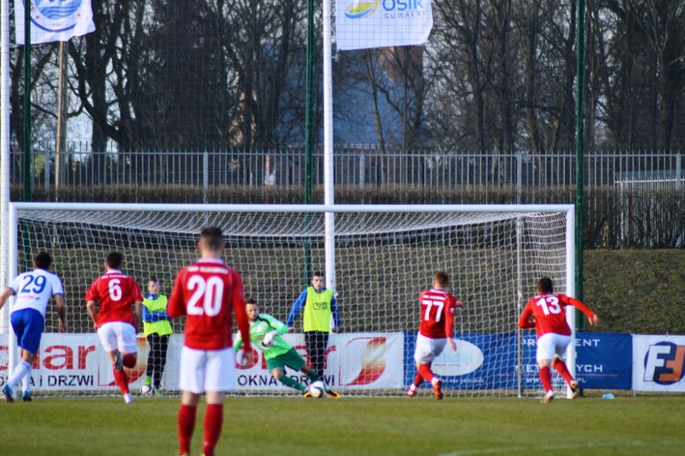 Zmarnowany przez zespół z Kluczborka karny uskrzydlił gospodarzy. W 20 minucie Kamil Adamek zmarnował okazje sam na sam z Oskarem Pogorzelcem. Reprezentacyjny bramkarz młodzieżówki z trudem, ale nie dal się przelobować, a po dobitce snajpera Wigier piłka rykoszetem polecił na aut. Pretensję do Adamka o brak podania miał Damian Kądzior, który po chwili przeprowadził piękną akcję prawym skrzydłem. Z linii końcowej wycofał do Macieja Wichtowskiego, który z pierwszej piłki dośrodkował idealnie na głowę Kamila Adamka. Najskuteczniejszy gracz Wigier nie do obrony posłał piłkę tuż przy dalszym słupku. Tak w 21 minucie suwalczanie zdobyli pierwszego w tym roku gola na własnym boisku.