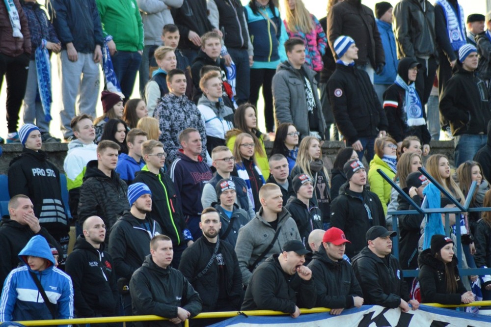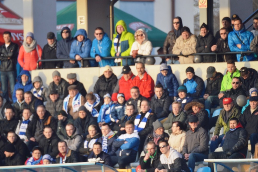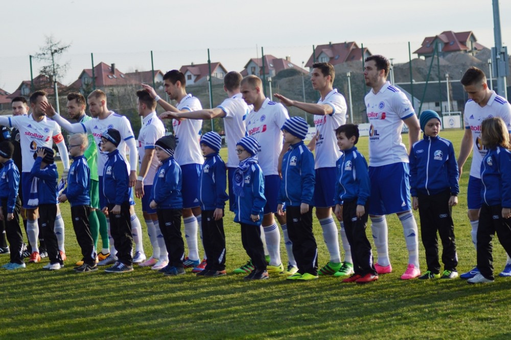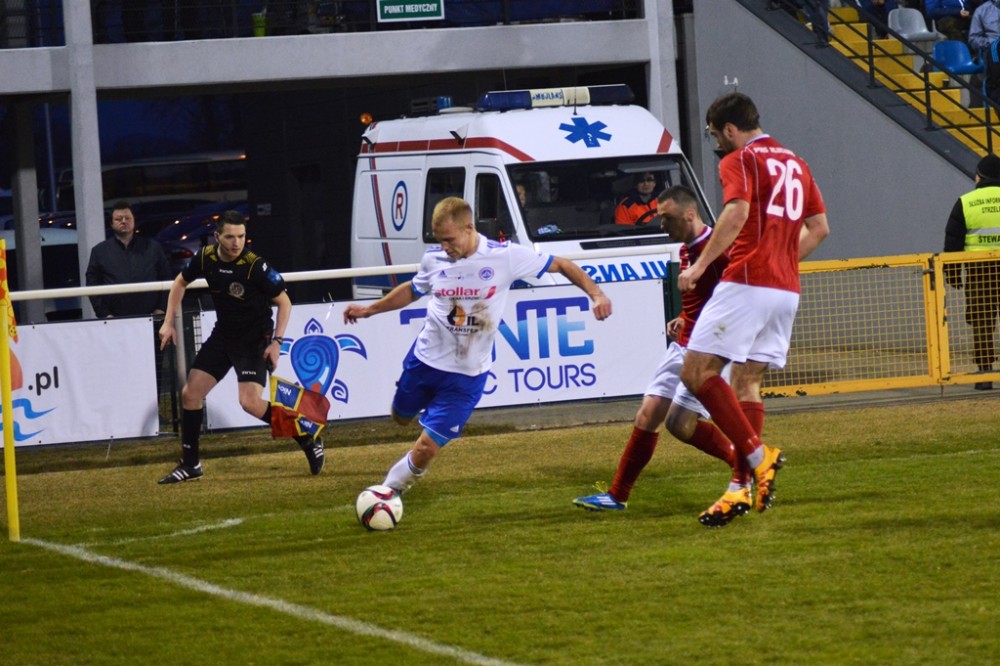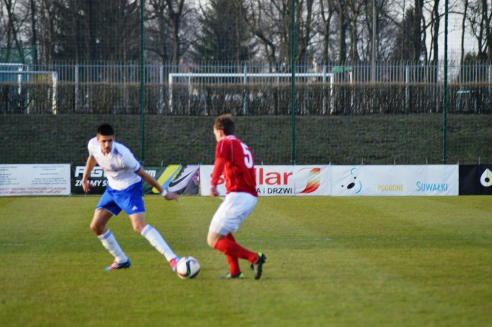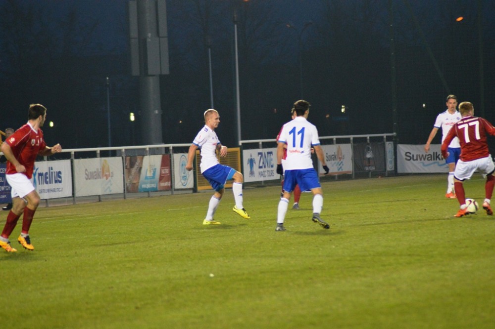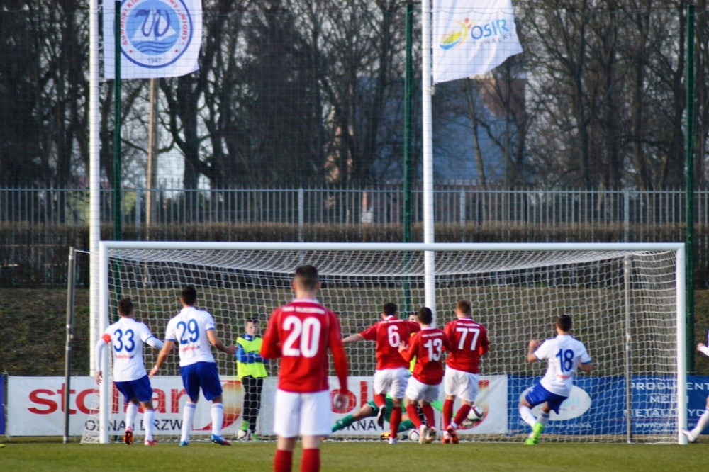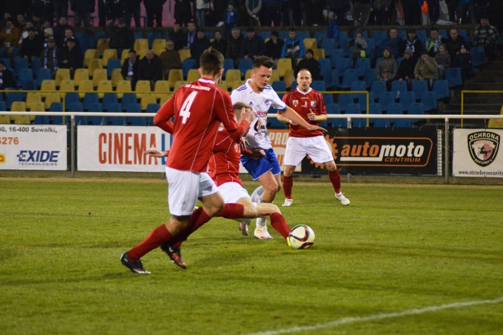 Zmarnowany przez zespół z Kluczborka karny uskrzydlił gospodarzy. W 20 minucie Kamil Adamek zmarnował okazje sam na sam z Oskarem Pogorzelcem. Reprezentacyjny bramkarz młodzieżówki z trudem, ale nie dal się przelobować, a po dobitce snajpera Wigier piłka rykoszetem polecił na aut. Pretensję do Adamka o brak podania miał Damian Kądzior, który po chwili przeprowadził piękną akcję prawym skrzydłem. Z linii końcowej wycofał do Macieja Wichtowskiego, który z pierwszej piłki dośrodkował idealnie na głowę Kamila Adamka. Najskuteczniejszy gracz Wigier nie do obrony posłał piłkę tuż przy dalszym słupku. Tak w 21 minucie suwalczanie zdobyli pierwszego w tym roku gola na własnym boisku.