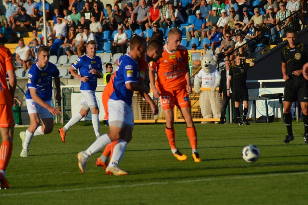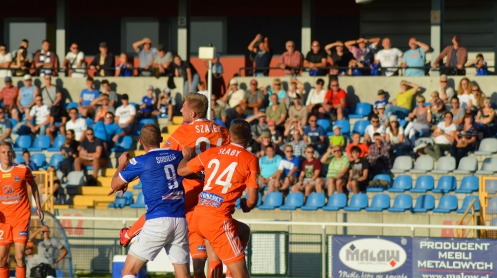 Termalica od początku miała inicjatywę i mozolnie przedzierała się przez ustawione przez gospodarzy na 30. metrze zasieki. Kapitalną okazję najpierw zmarnował Vladislavs Gutkovskis, potem z ośmiu metrów minimalnie niecelnie huknął lewa nogą Martin Miković, a po strzałach głową Bartosza Śpiączki piłka otarła się od poprzeczki, a następnym razem złapał ją Damian Węglarz.