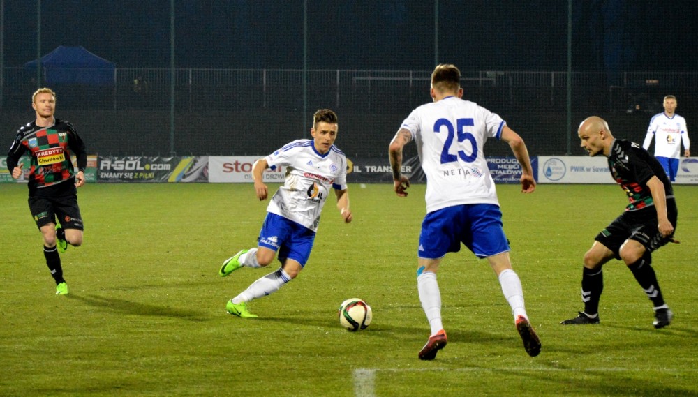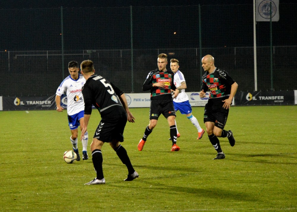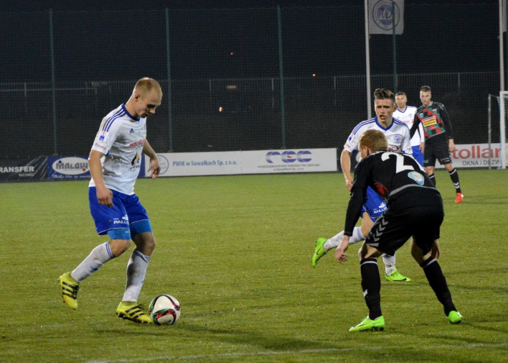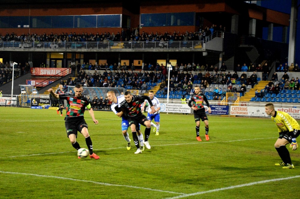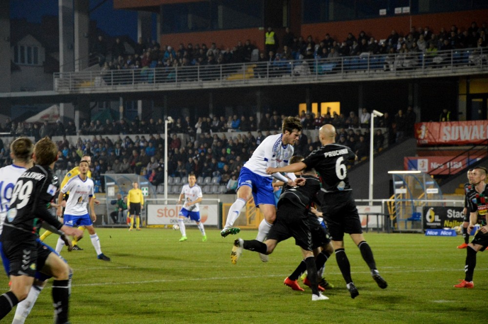 Gola, a nawet dwa suwalczanie powinni byli wbić już do przerwy. Kamil Adamek strzelił "w długi róg" o centymetry obok słupka, a po ślicznej akcji Janusza Bucholca, Damiana Gąski i Damiana Kądziora, zakończonej ładnym strzałem tego ostatniego w okienko, Paweł Florek popisał się kapitalną paradą i zdołał sparować piłkę na róg.
