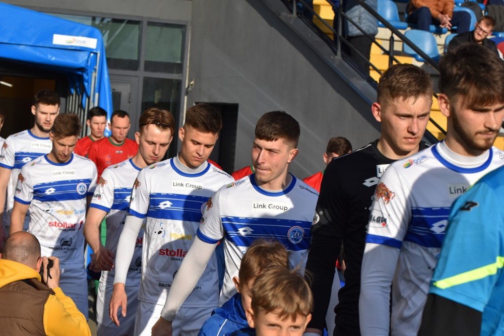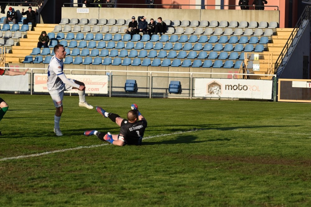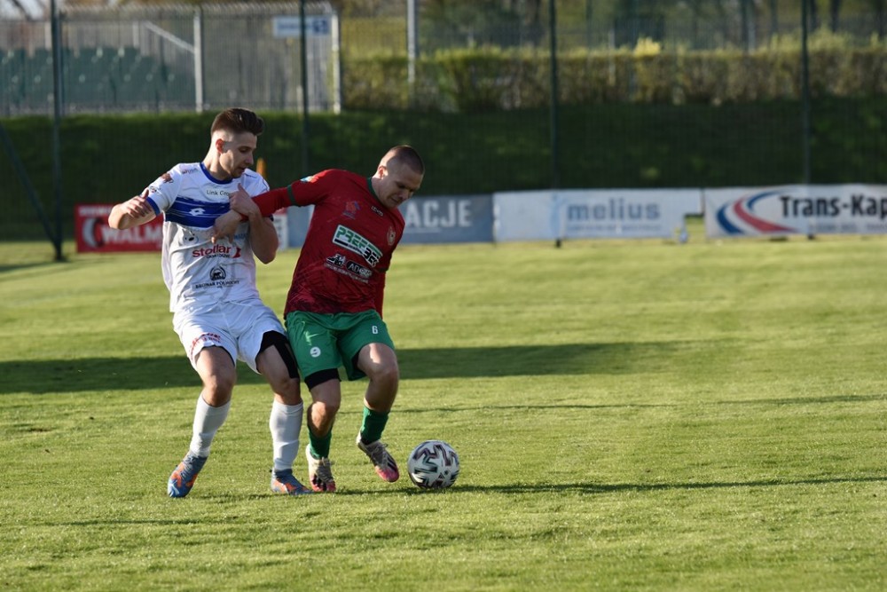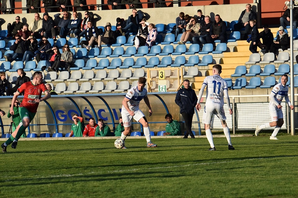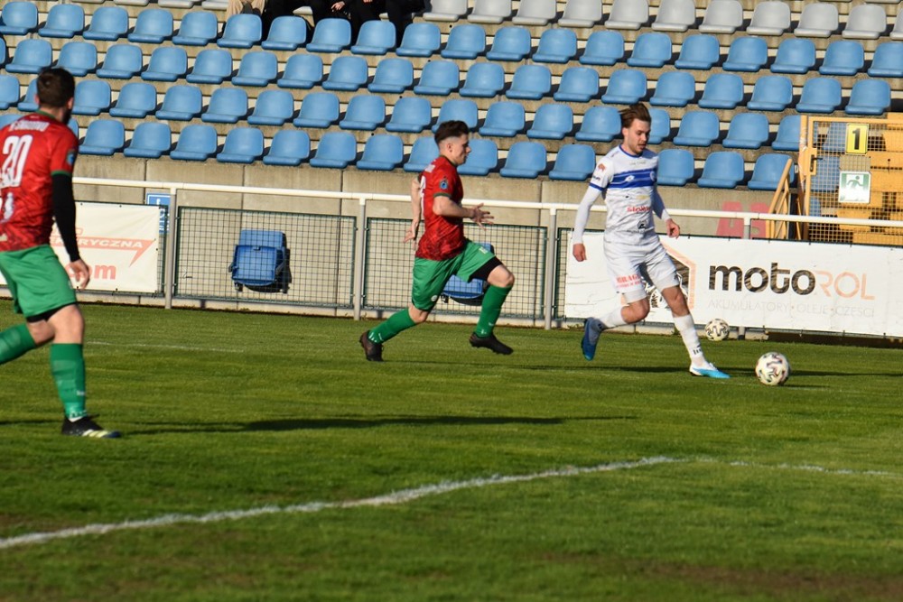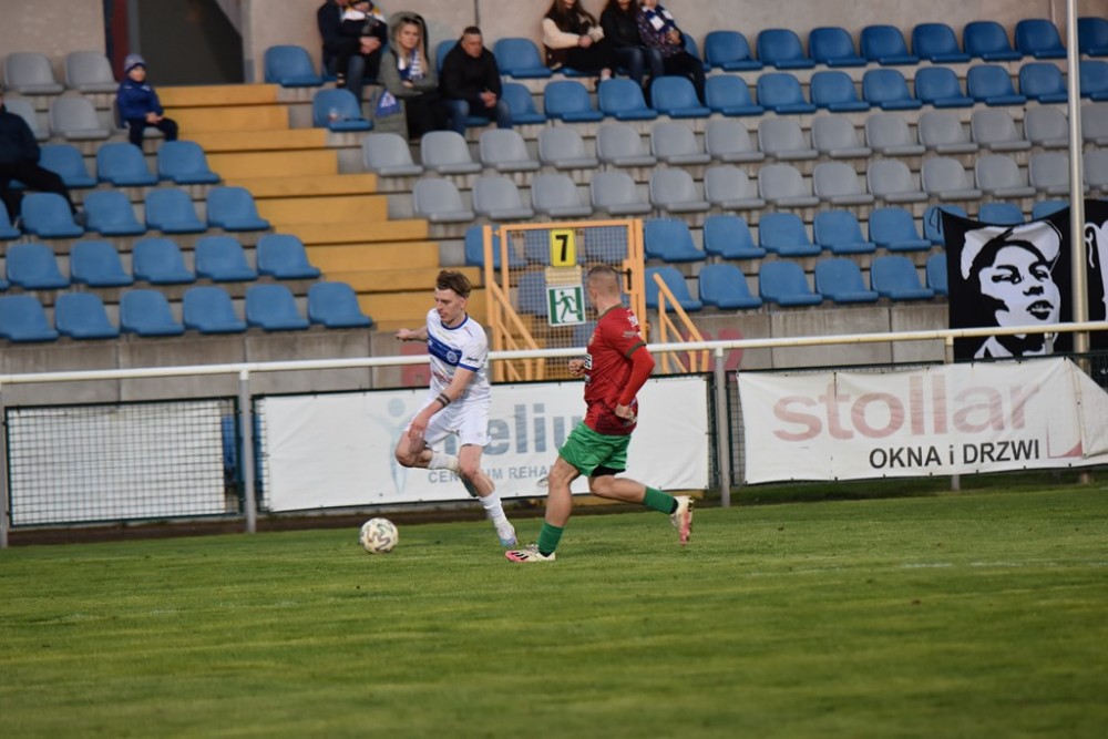 Po zmianie stron ambitnie zaatakowali goście, ale to Biało-Niebiescy, którzy zyskali więcej przestrzeni, stwarzali sobie dogodne sytuacje. Najpierw z daleka tuż obok spojenia uderzył niemiłosiernie faulowany w tej części spotkania Łukasz Trąbka, potem przytomnym przejęciem piłki błysnął Marcin Fiedorowicz, który w decydującym momencie, niestety, podał do przeciwnika. Wreszcie, a lewej strony wzdłuż linii pola bramkowego zagrał Dawid Kalinowski, ale dobrze ustawiony Krzysztof Cudowski fatalnie skiksował.