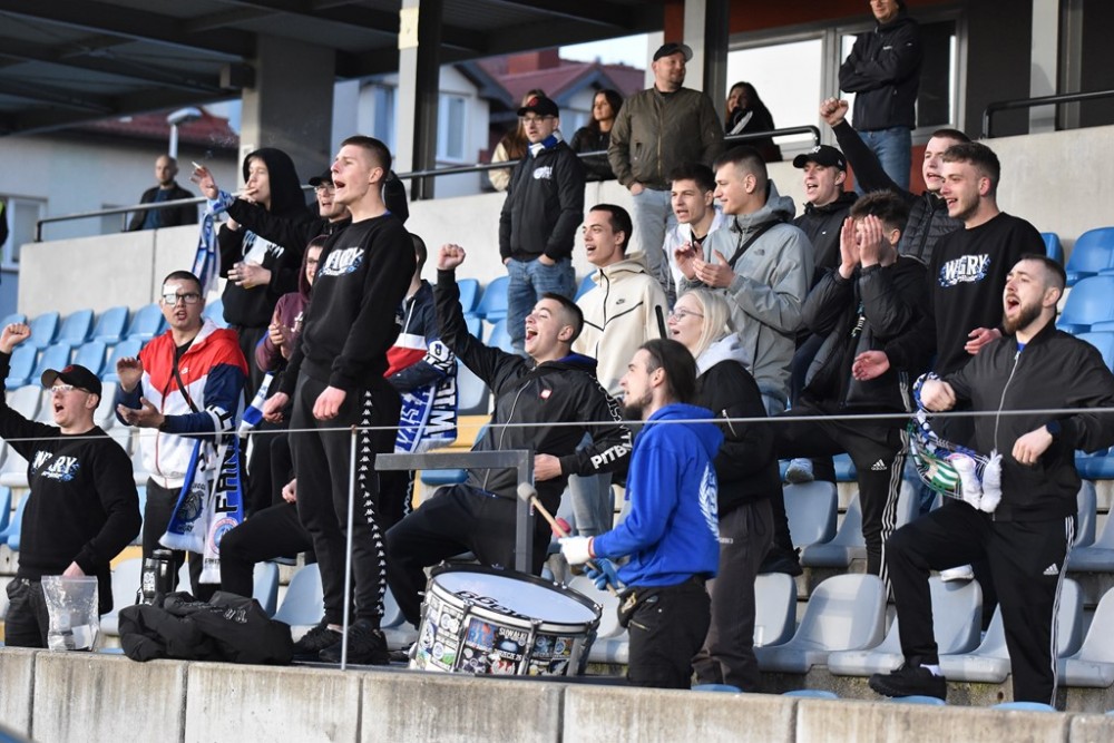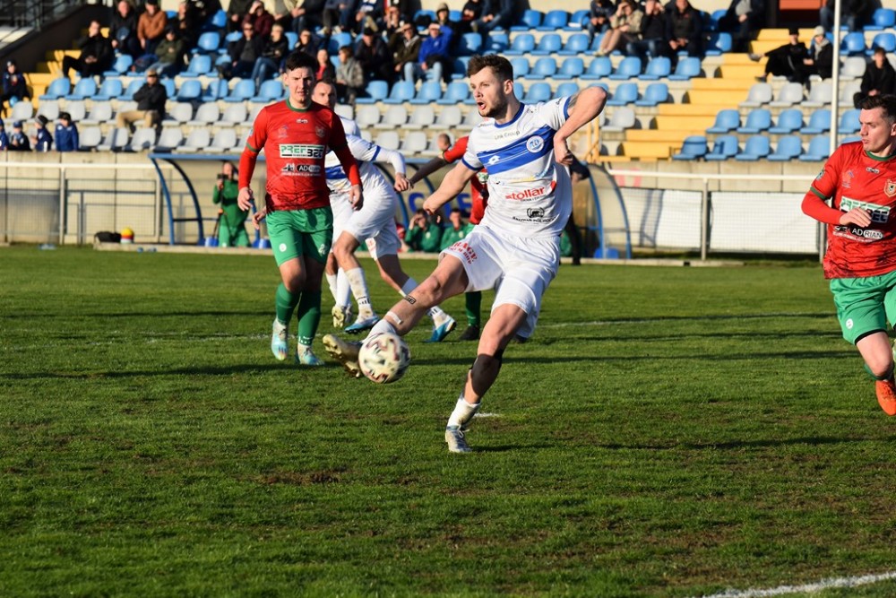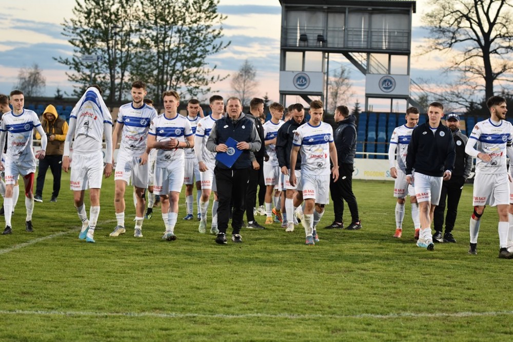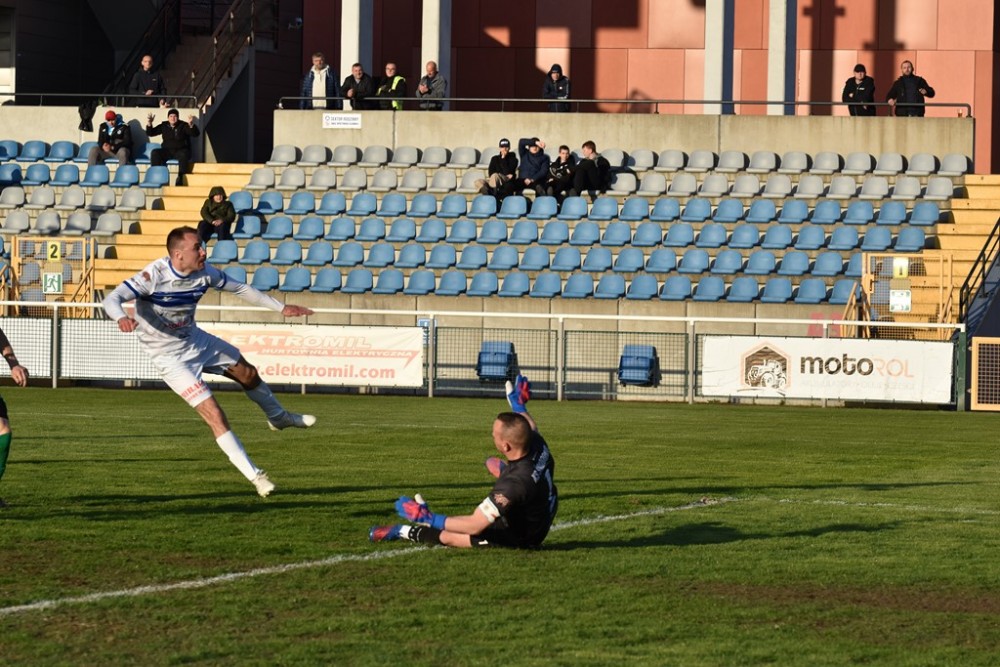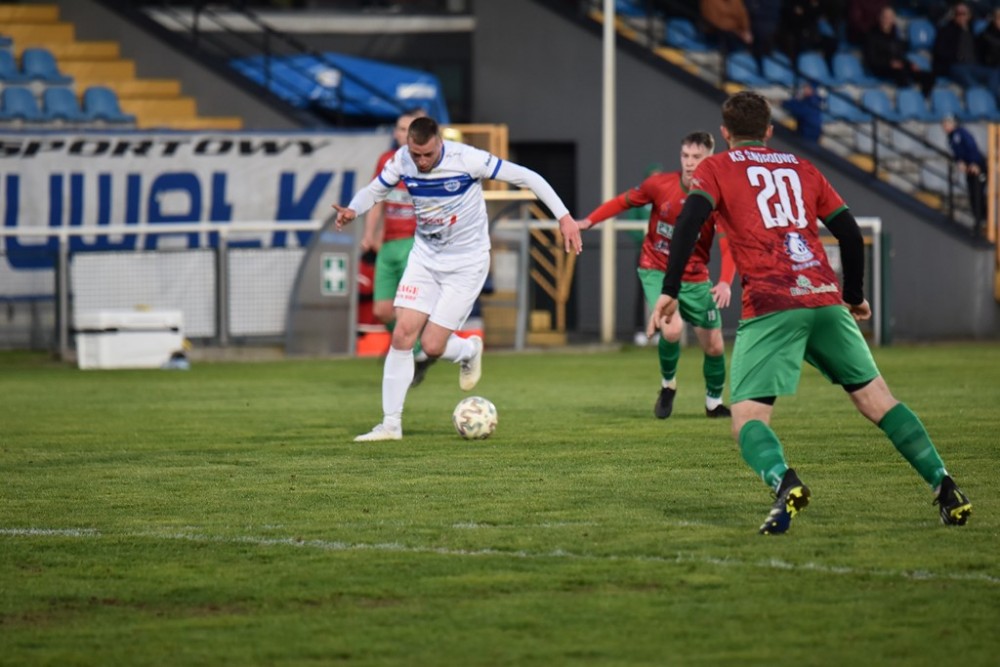 Po zmianie stron ambitnie zaatakowali goście, ale to Biało-Niebiescy, którzy zyskali więcej przestrzeni, stwarzali sobie dogodne sytuacje. Najpierw z daleka tuż obok spojenia uderzył niemiłosiernie faulowany w tej części spotkania Łukasz Trąbka, potem przytomnym przejęciem piłki błysnął Marcin Fiedorowicz, który w decydującym momencie, niestety, podał do przeciwnika. Wreszcie, a lewej strony wzdłuż linii pola bramkowego zagrał Dawid Kalinowski, ale dobrze ustawiony Krzysztof Cudowski fatalnie skiksował.