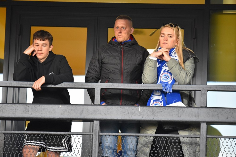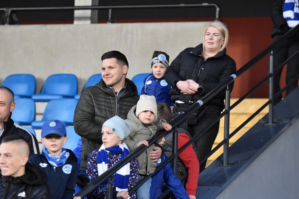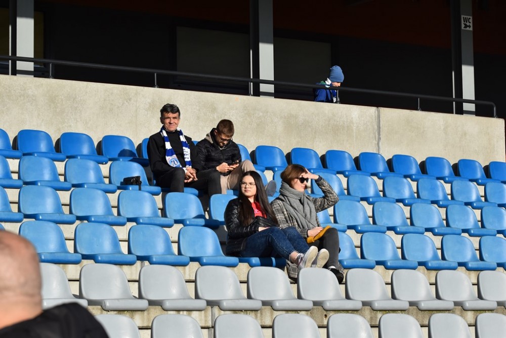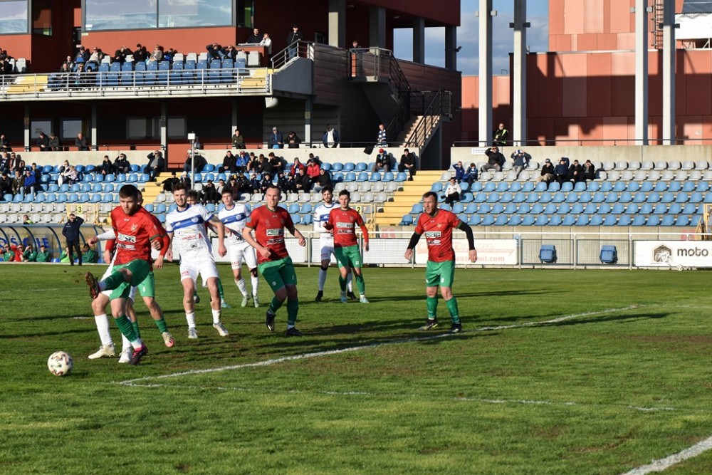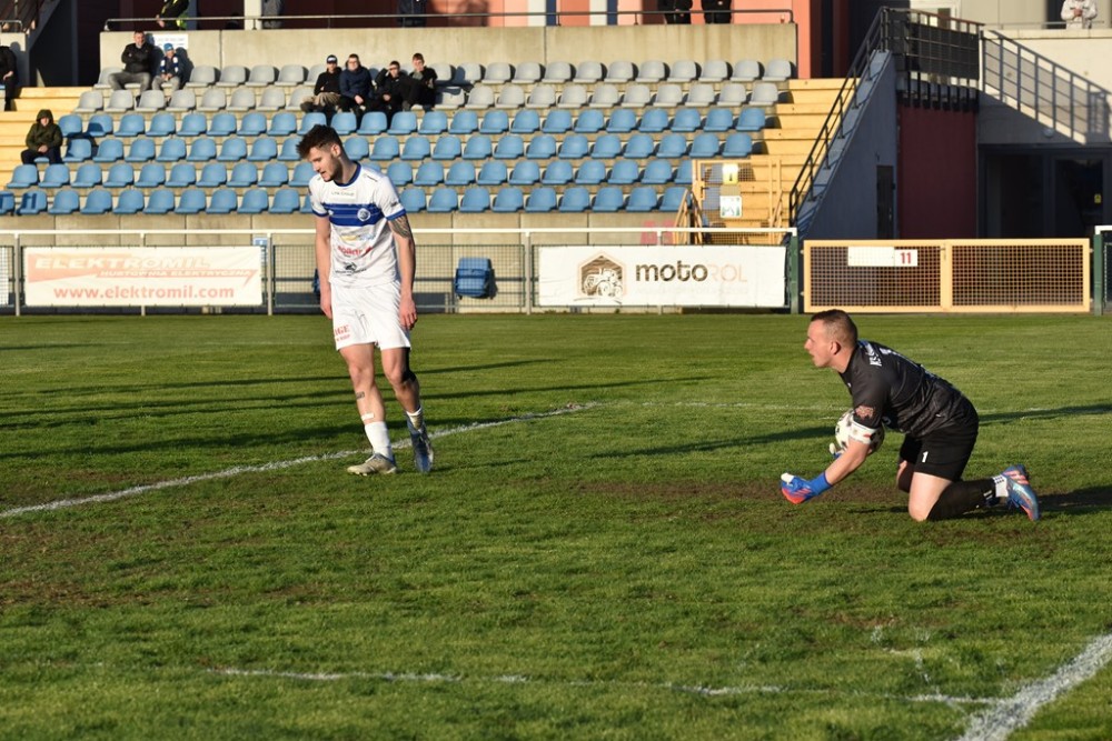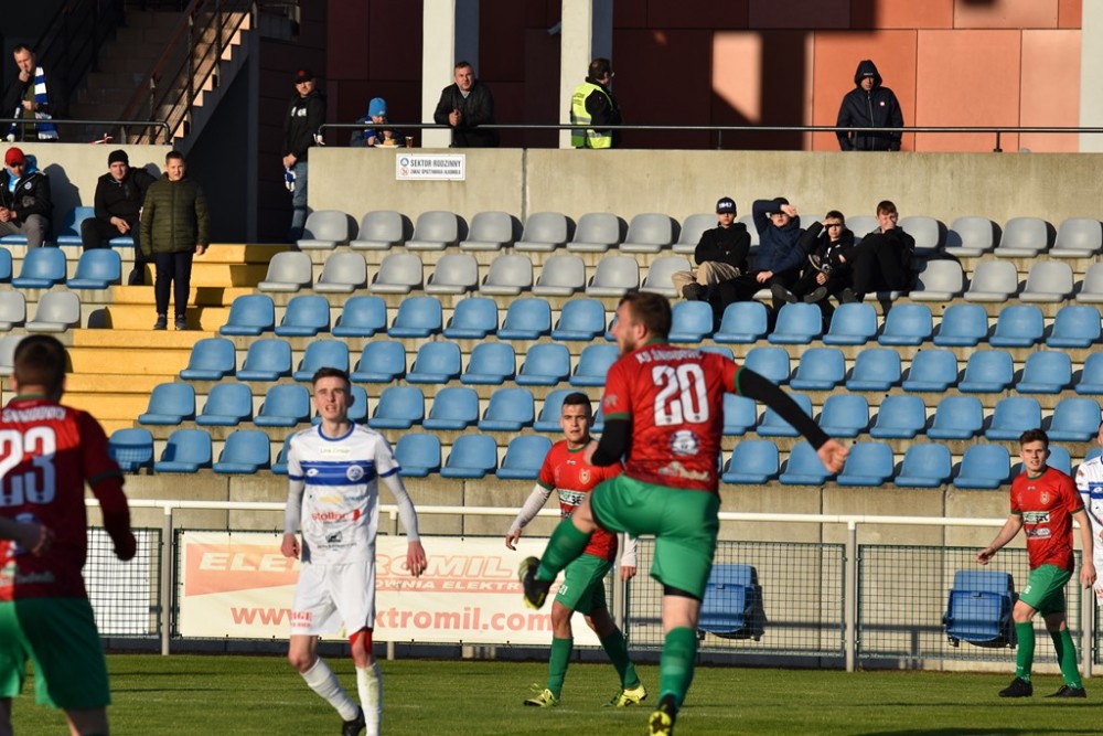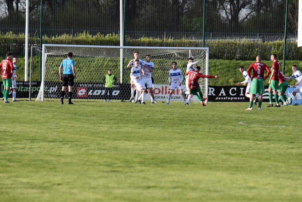 Gopodarzom ciężko było sforsować dwie linie defensywne. Próbowali ataków głównie prawym skrzydłem, gdzie bardzo aktywni byli Łukasz Trąbka i Mariusz Bucio. Ten drugi najpierw sam próbował z ostrego kąta pokonać może nie imponującego wzrostem, ale na pewno tak refleksem i zwinnością Daniela Wysockiego, a potem z rzutu wolnego ładnie podał do Krzysztofa Cudowskiego, który uderzył tuż przy prawym słupku.