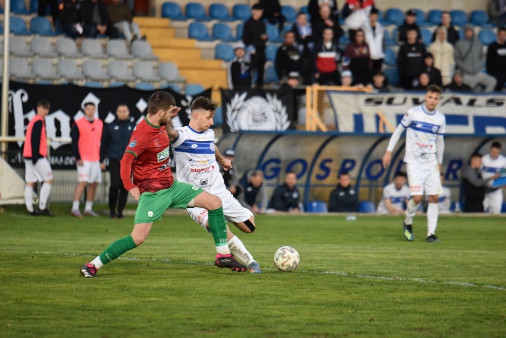 Przyjezdni umiejętnie się bronili, a piłkarzom suwalskiej drużyny brakowało ostatniego podania. Na szczęście, do czasu. W 40 minucie piłka trafiła do Bartosza Gużewskiego, który idealnym, prostopadłym zagraniem między obrońców sprawił, że Radosław Gulbierz znalazł się w sytuacji sam na sam z bramkarzem gości. Doświadczony wahadłowy nie zmarnował okazji i do przerwy Wigry prowadziły 1:0.