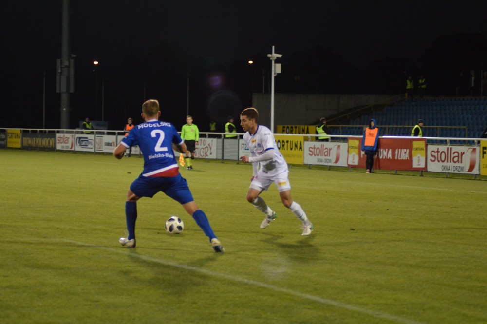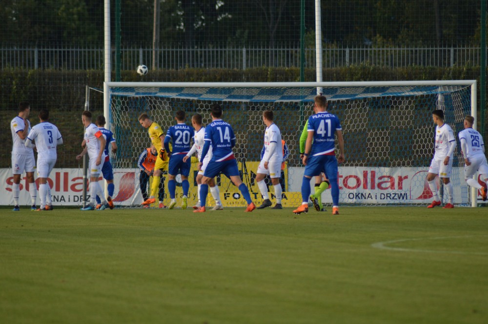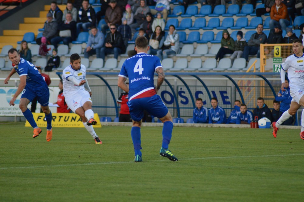 Wigry od poczatku prowadziły grę, dłużej utrzymywały się przy piłce. Po raz pierwszy zostały skarcone w 17 minucie, kiedy rzut wolny wykonywał Filip Karbowy i goście przejęli piłkę. Poszła akcja prawą stroną i dośrodkowanie. Piłki nie siegnął głową Łotysz Valerisj Sabala, ale na miejscu był zamykający akcję Przemysław Płacheta. Sprawadzony latem do Bielska Białej z Pogoni Siedlce młodzieżowiec płaskim strzałem w kierunku dalszego słupka nie dał szans Damianowi Węglarzowi.