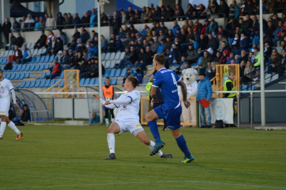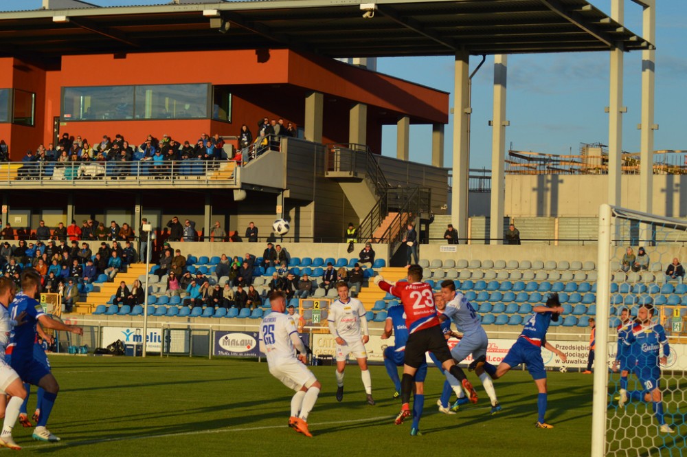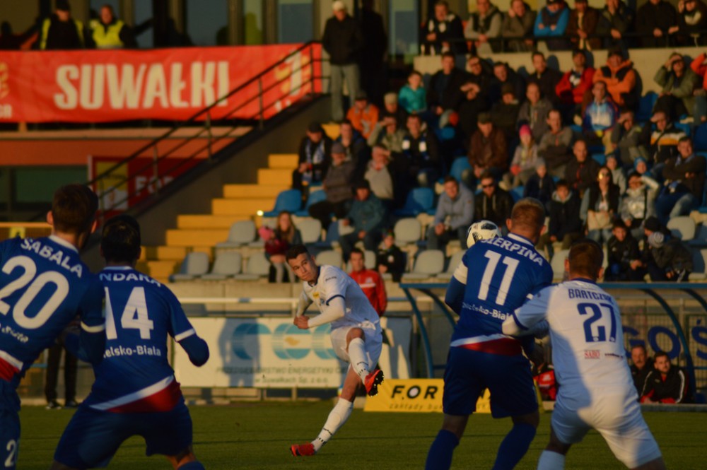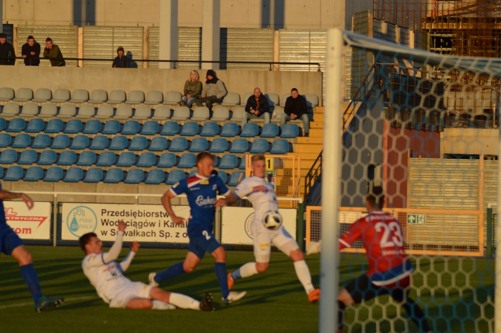 Przed przerwą Przemysław Płacheta zdobył dwa gole w odstępie 5 minut, a po zmianie stron Valerij Sabala, dotychczas współlider klasyfikacji najskuteczniejszych, dorzucił do 5-bramkowego dorobku kolejne dwa trafienia w ciągu 4 minut. W 56 minucie, zupelnie nie niepokojony przez suwalskich defensorów przymierzył z 18 metrów w lewe okienko bramki Damiana Węglarza, a po godzinie gry dostał dokładne podanie na głowę od Filipa Modelskiego i zamykając kontratak bardzo pewnie wpakował piłkę do siatki.