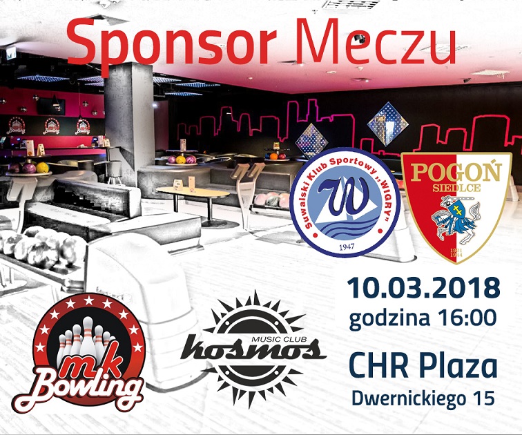 Lekki skok w tabeli mogą też zaliczyć Wigry, jeżeli w sobotę na własnym boisku rozprawią się z Pogonią Siedlce. Sponsorem pierwszego w tym roku meczu na Zarzeczu jest Centrum Rozrywki Mk Bowling, największa strefa rozrywki w mieście, polecająca pizzę z pieca opalanego drewnem, lunche i makarony, niezapomniane imprezy integracyjne, grę w kręgle połączoną z cateringiem.