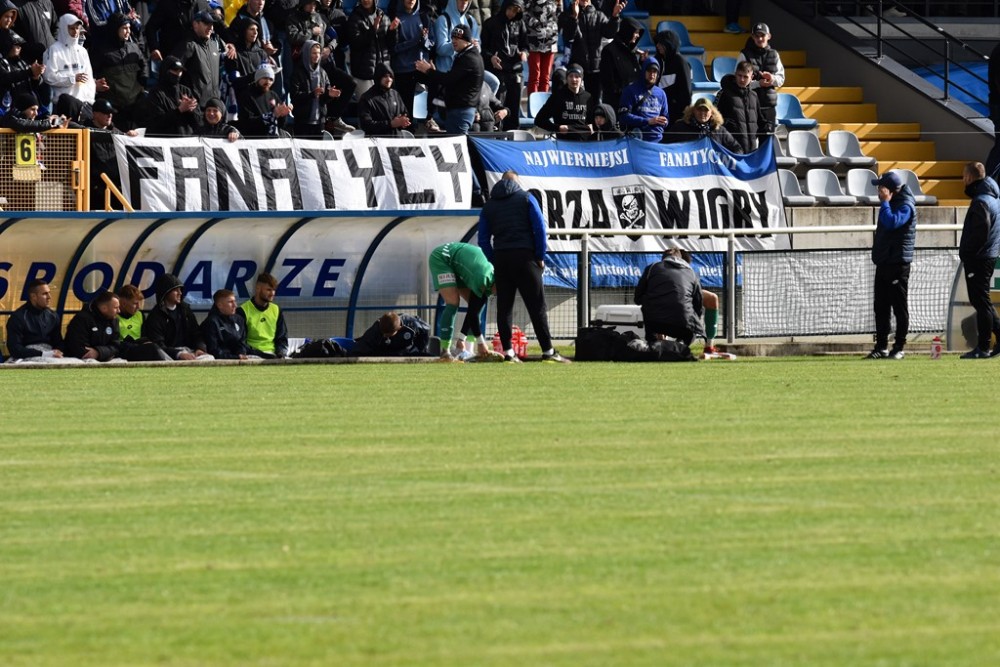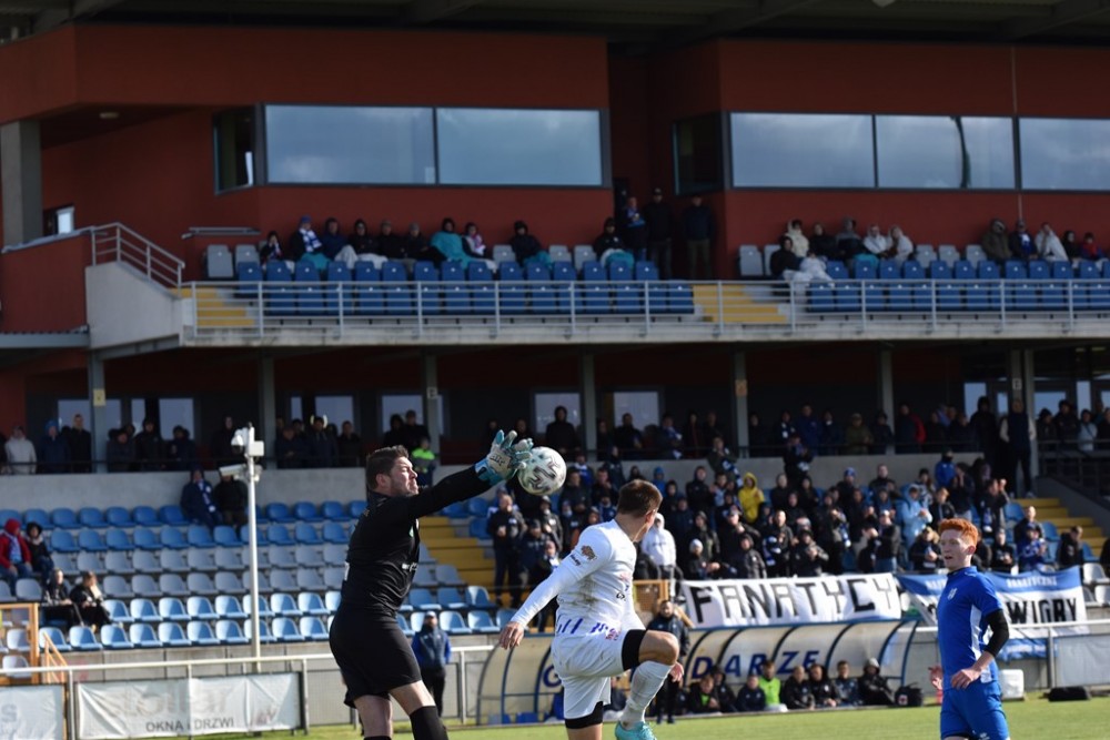 Piłkę przejął Bartosz Gużewski, podał do Macieja Makuszewskiego, który pomkną lewą stroną i wyłożył piłkę na siódmy metr Kamilowi Zalewskiemu. Nie zdołał jej sięgnąć Rafał Rakowiecki i snajper Wigier miał przed sobą pusta bramkę. Kamil Zalewski mógl przyjąć piłkę i spokojnie posłać ją do siatki, ale na sliskiej nawierzchni nerwowo uderzył z pierwszej piłki i nie trafił w bramkę.