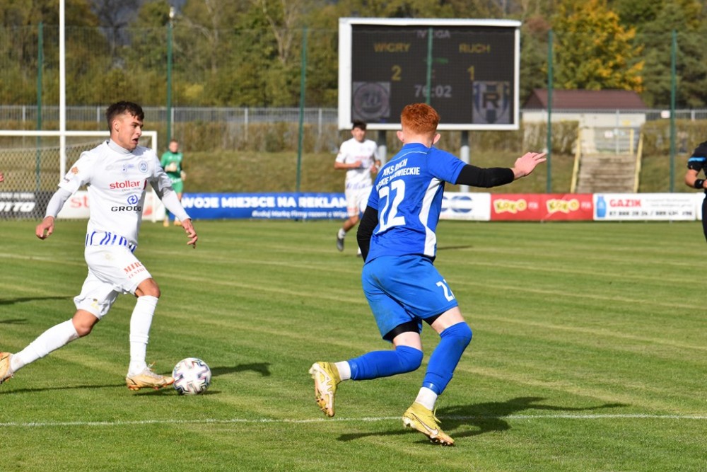 Wigry prowadziły 2:0, ale Ruch rychło zdobył kontaktowego gola. Po wrzutce z rzutu wolnego, zakotłowało się pod bramkę Wigier, Maciej Aleksandrowicz odbił pierwszy strzał, ale przy dobitce z bliska Damiana Decewicza był już bezradny.