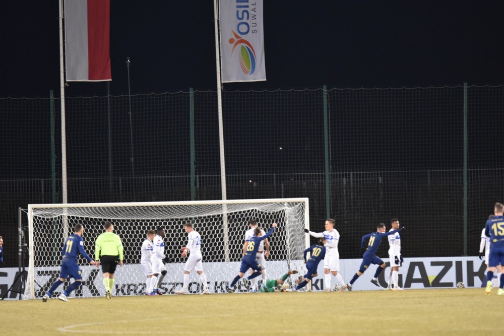 W 94 minucie gry jeszcze raz piłkę w pole karne posłał Denis Gojko, którą przyjął sobie Mateusz Lewandowski. Napastnik suwalczan odwrócił się w kierunku bramki i oddał mocny, celny strzał, ale golkiper przyjezdnych zdołał to wybronić.