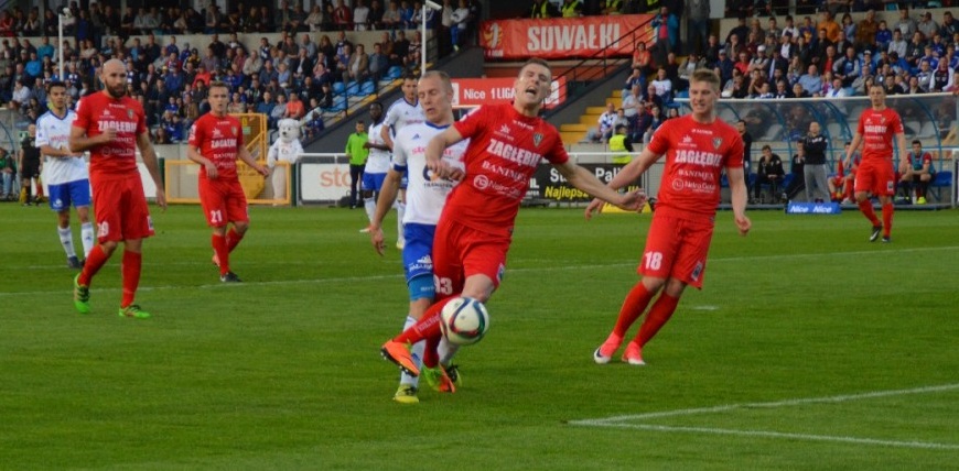 Mecz Wigier z Zagłębiem, w którym suwalczanie chcą wziąc odwet za ubiegłoroczne 0:3 (na zdjęciu) zakończy 27. kolejkę spotkań, w której nie zabrakło sensacji i niespodzianek. W piątek klęski 0:6 z Pogonią Siedlce doznał Ruch Chorzów, a w sobotę punkty stracili lider i wicelider. Miedź Legnica zremisowała w Bielsku-Białej, a Chrobry Głogów u siebie, po dramatycznym, obfitującym w zmarnowane okazje spotkaniu, kontuzji uchodzącego za najlepszego gracze Nice I Ligi Mateusza Machaja i czerwonej kartce Łukasza Szczepaniaka, przegrał 0:2 z Katowicami, które zastąpiły go na drugim miejscu.
