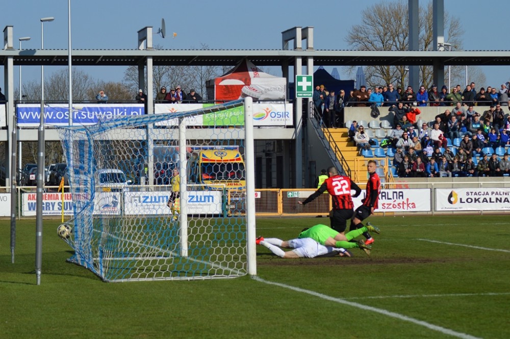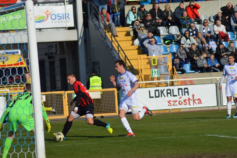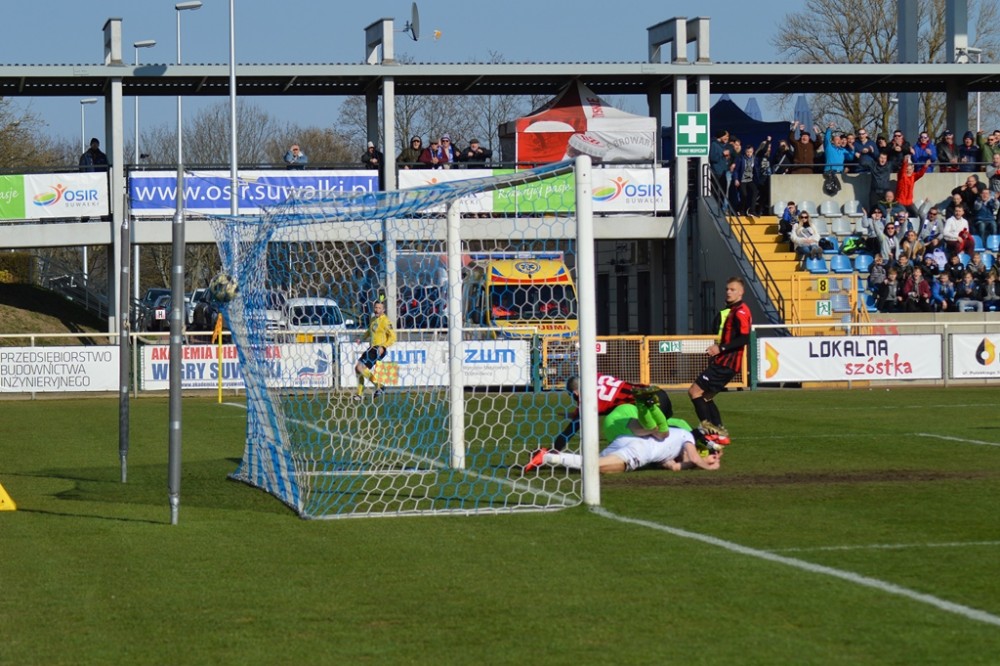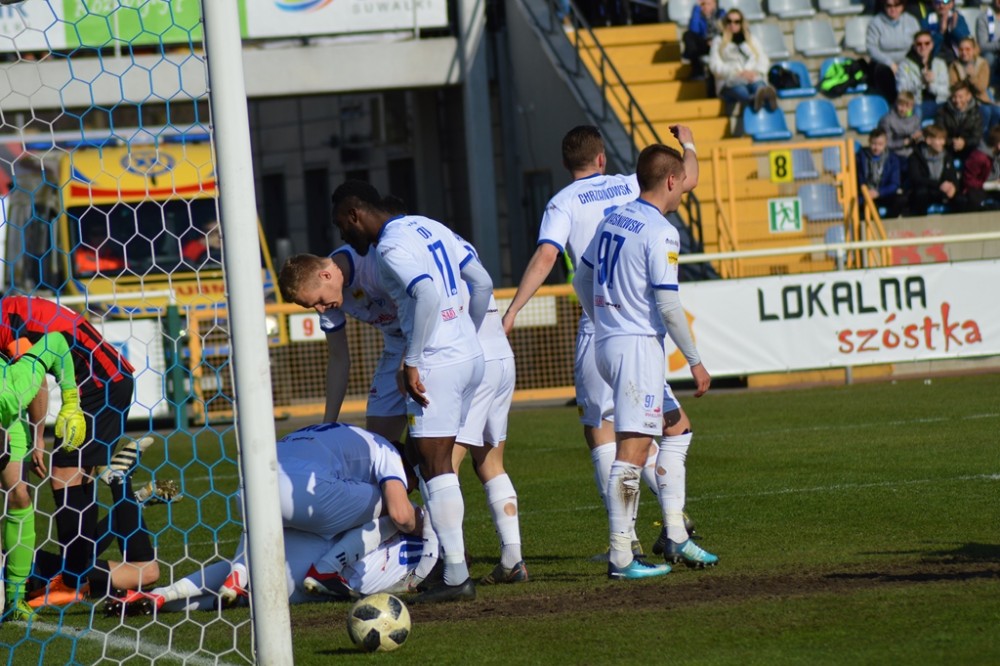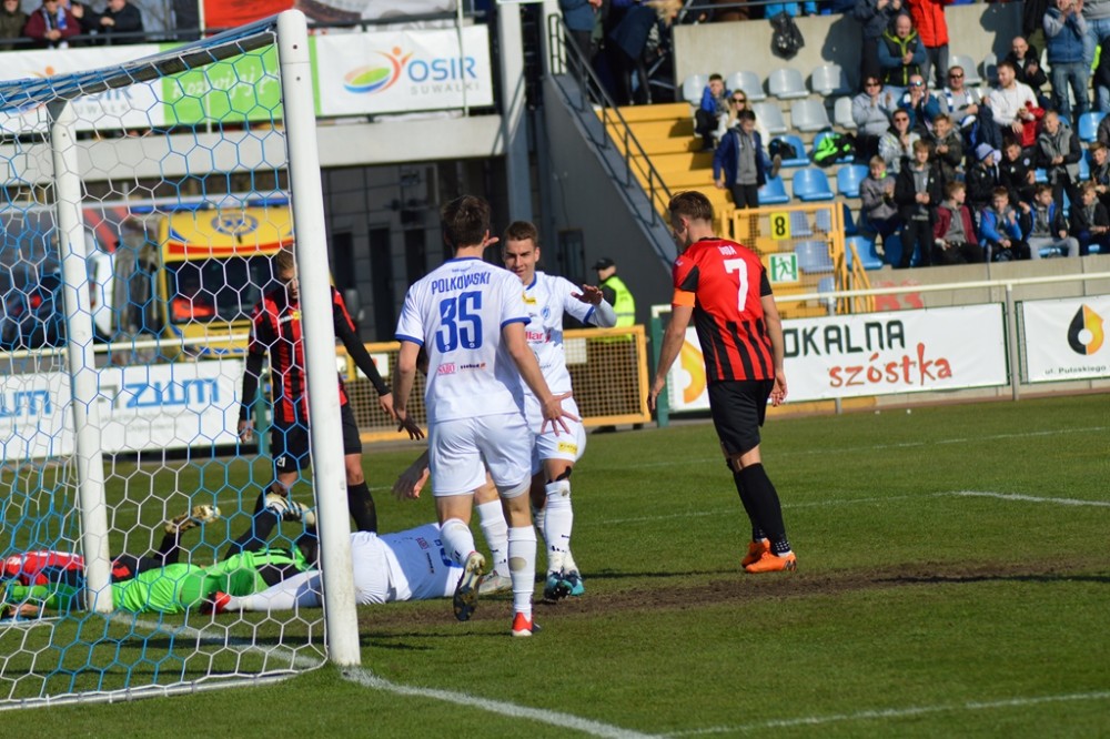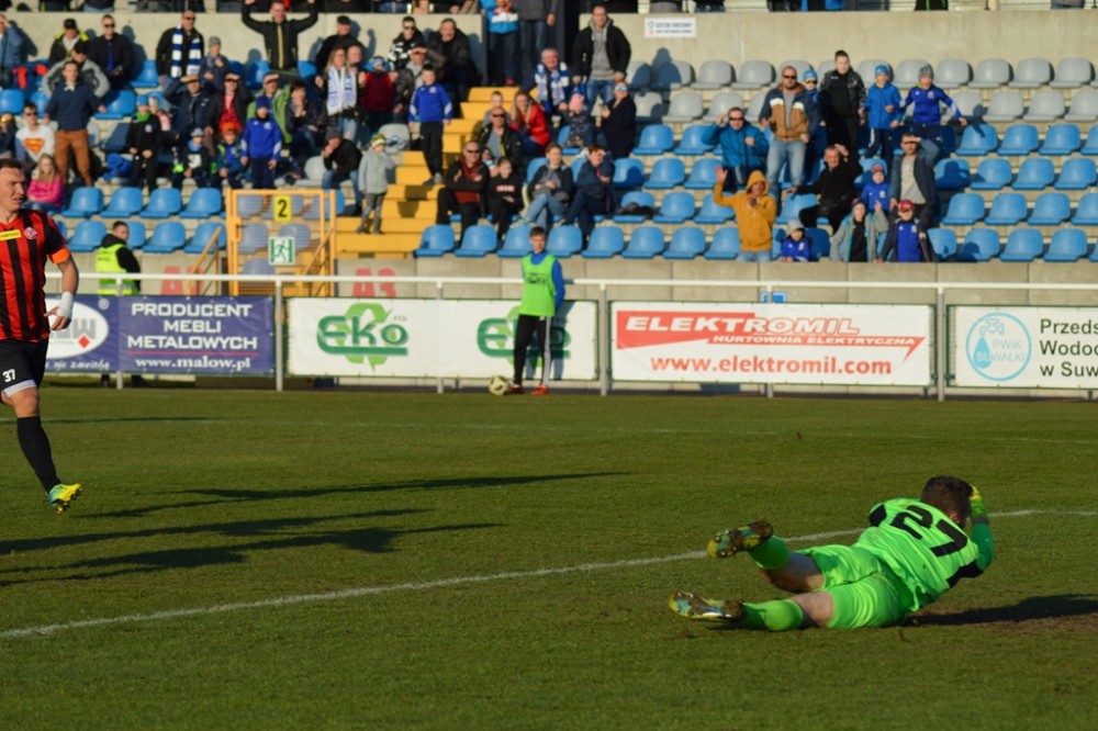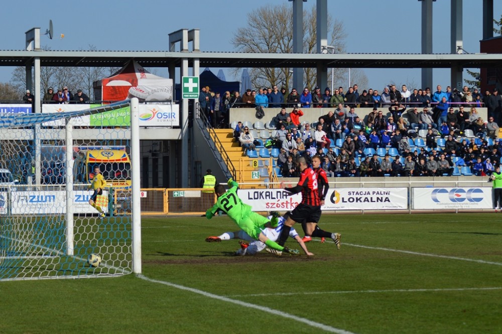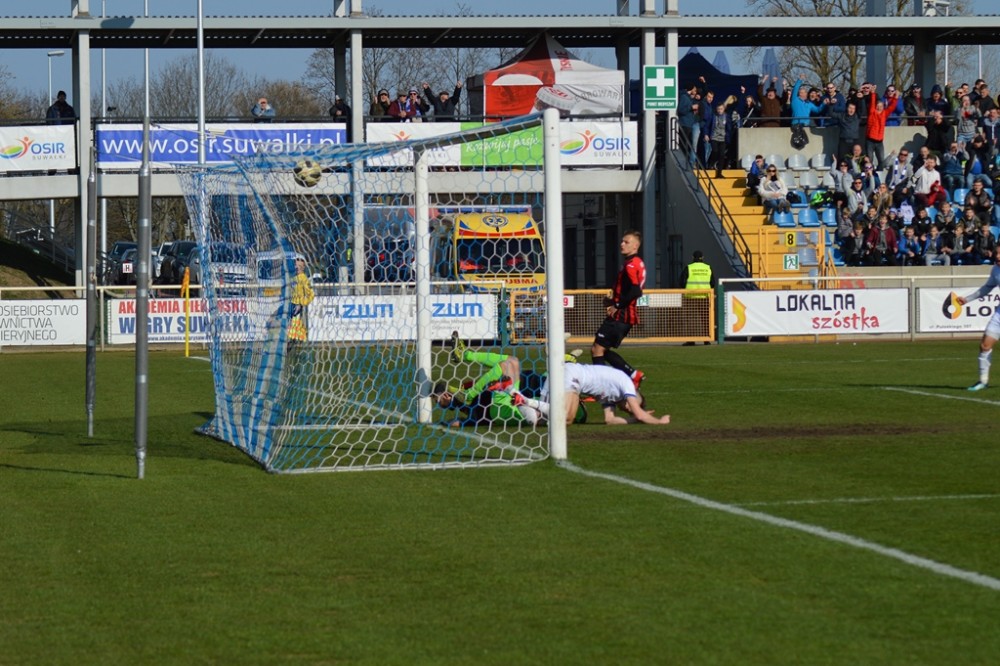 Najpierw jednak za ciosem próbowali próbowali pójść grający z poświeceniem piłkarze suwalskiej drużyny. Z dystansu mocno, ale w środek bramki huknął Dawid Polkowski, a po uderzeniu głowa Joela Huartasa bramkarz gości z trudem przeniósł piłkę nad poprzeczkę.