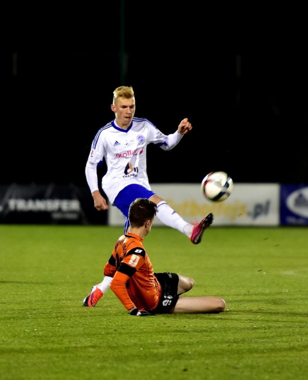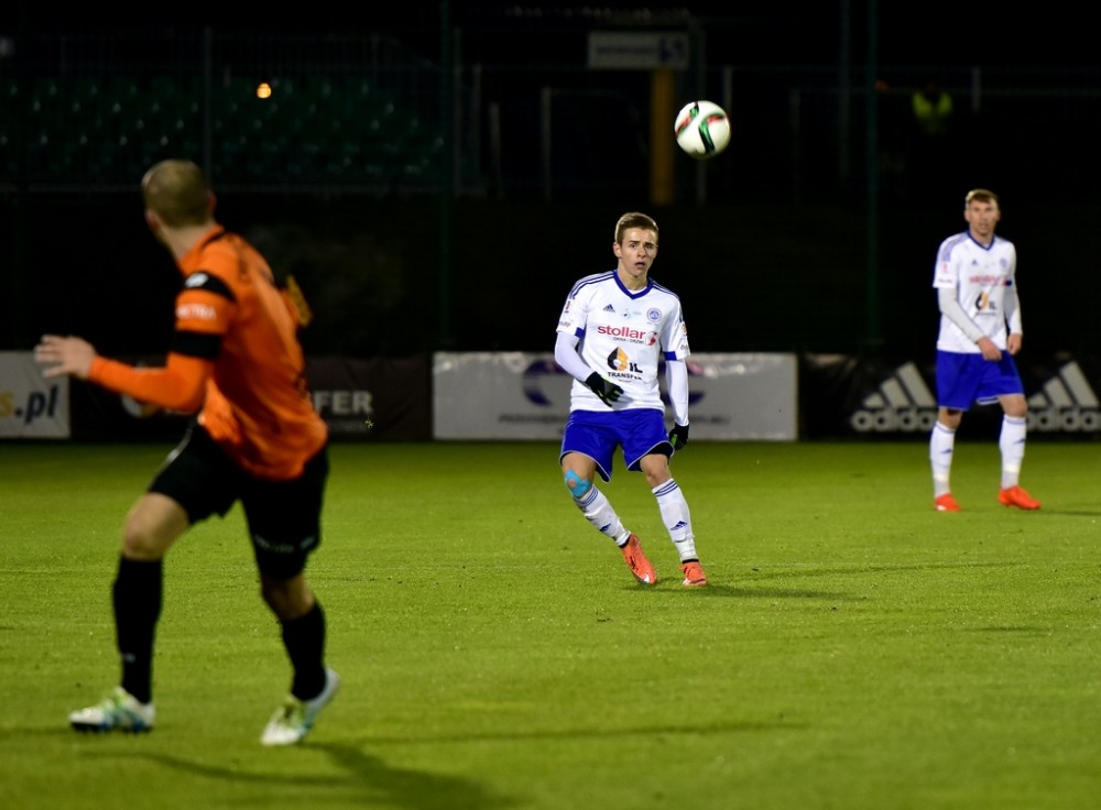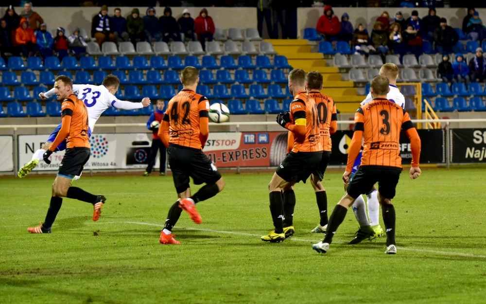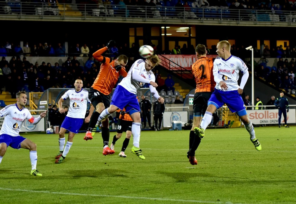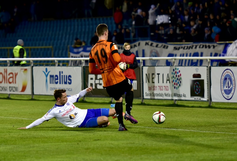 Chrobry potrzebował dwóch podań, by zdobyć kontaktowego gola. Kopnięcie od środka, dośrodkowanie Pawła Wojciechowskiego i Mateusz Machaj, przy biernej postawie obu stoperów, strzałem głową pokonał Karola Salika.