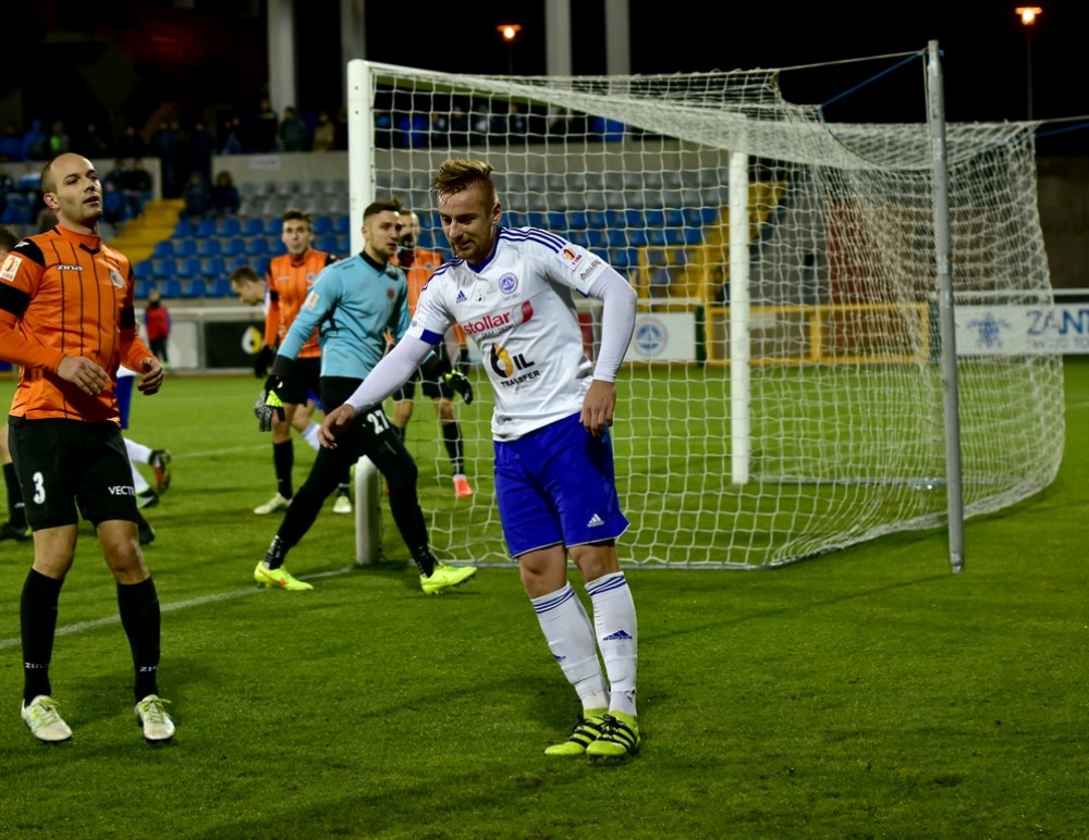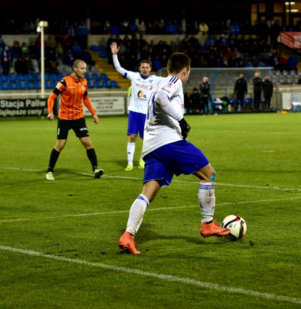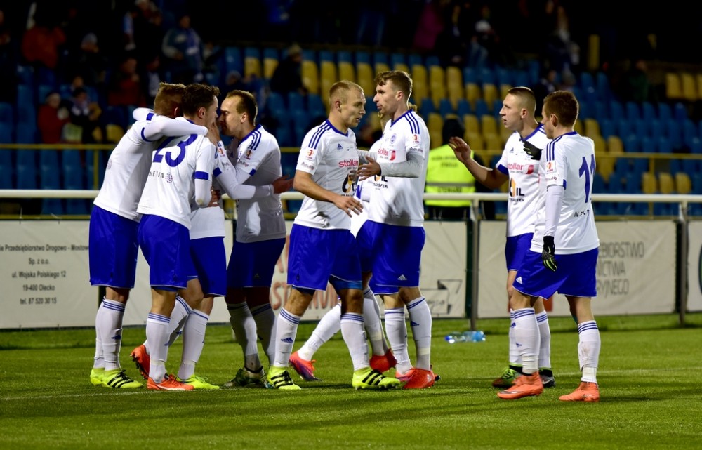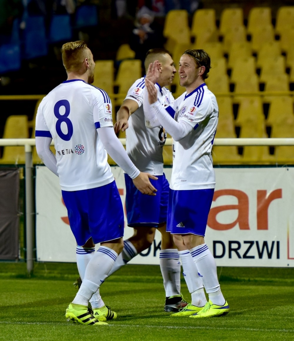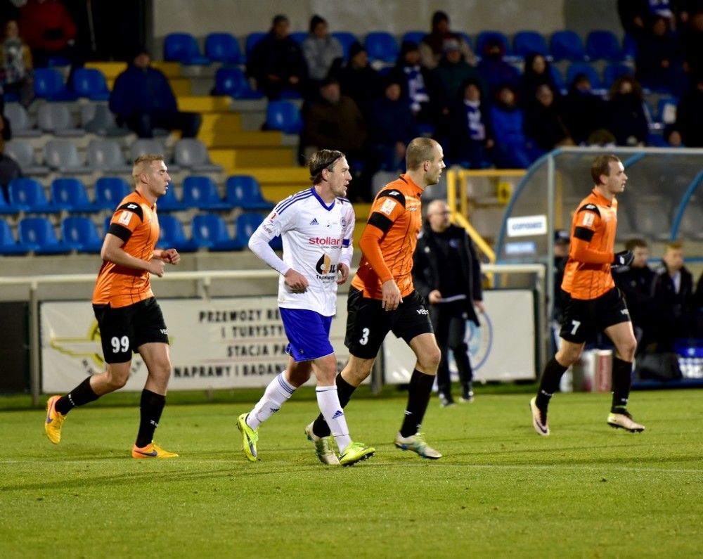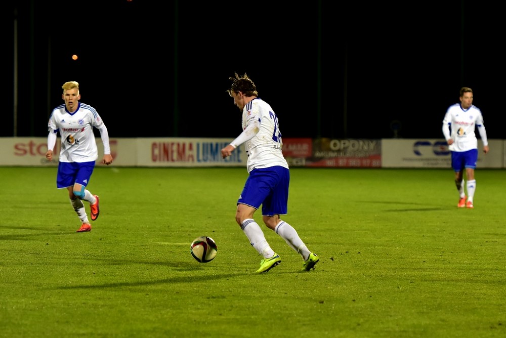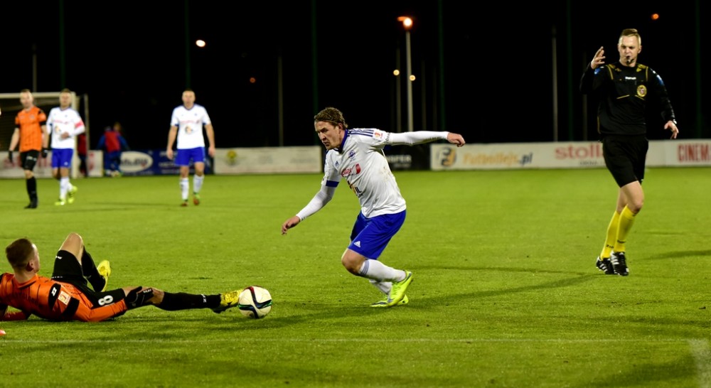Wysoki pressing zaowocował już po 10 minutach. Kamil Adamek kropnął w samo spojenie, a odbitą piłkę przejął Damian Gąska i przytomnie dośrodkował do podążającego za własną akcją Adamka. Najskuteczniejszy wśród biało-niebieskich z bliska wpakował futbolówkę do siatki i cieszył się ze swojego szóstego ligowego gola w sezonie.