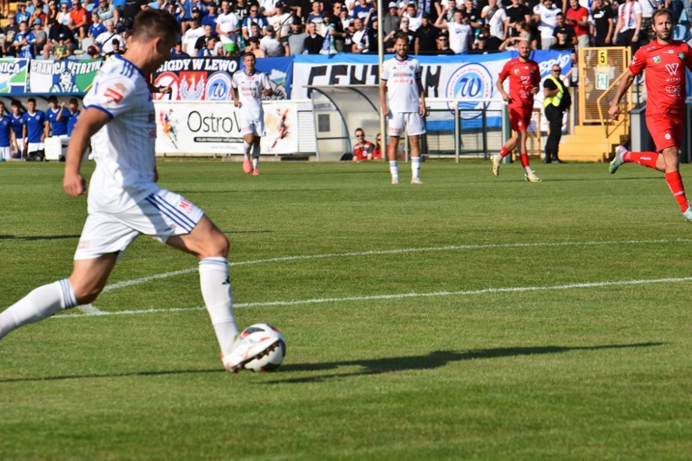 Więcej okazji od Patryka Bednarczyka miał Kamil Zalewski. Super strzelec Wigier nie miał szczęścia, ani chłodnej głowy. Mógł wyprowadzić Biało-Niebieskich na prowadzenie już w 4 minucie, ale minimalnie chybił oraz minutę później, kiedy spokojnie mógł przyjąć piłkę na kletkę piersiową i uderzyć nogą, ale zdecydował się na strzał główką, a piłka poleciała nad poprzeczką.