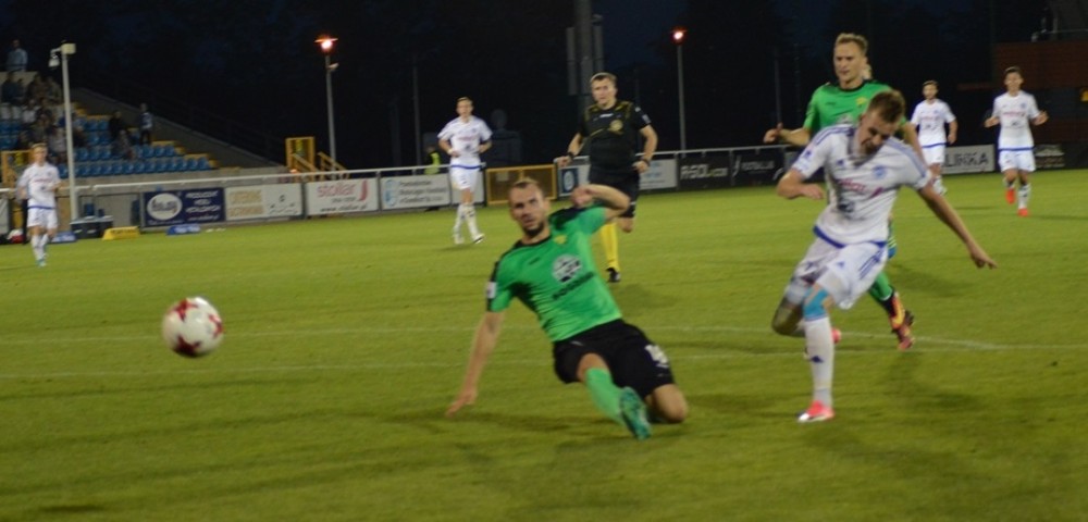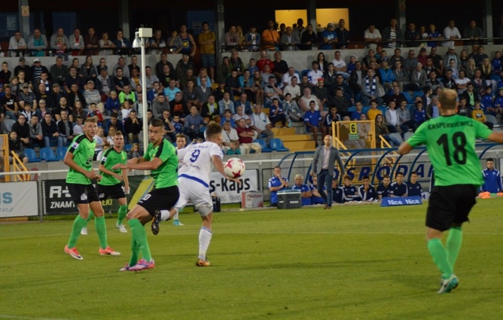 Po dośrodkowaniu z rożnego, ze środka pola karnego uderzył Patryk Klimala, ale Sergiusz Prusak intuicyjnie odbił piłkę i nie dal się pokonać przy trzech dobitkach Mateusza Radeckiego. Później, po dwójkowej akcji Karola Mackiewicza i Pawła Olszewskiego, futbolówka trafiła na głowę Radeckiego, ale rosły pomocnik strzelił siedmiu metrów nad poprzeczka. Wreszcie, po szybkiej kontrze kapitalne podanie od Mariusza Rybickiego otrzymał biegający raz po prawej, raz po drugiej stronie Mackiewicz, ale huknął swoją lepszą, lewa noga tuz obok słupka.